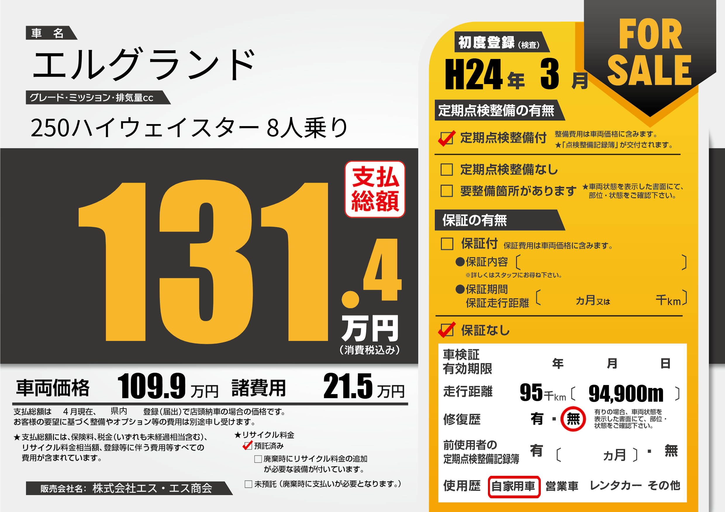| 車名 | エルグランド | グレード ミッション 排気量 |