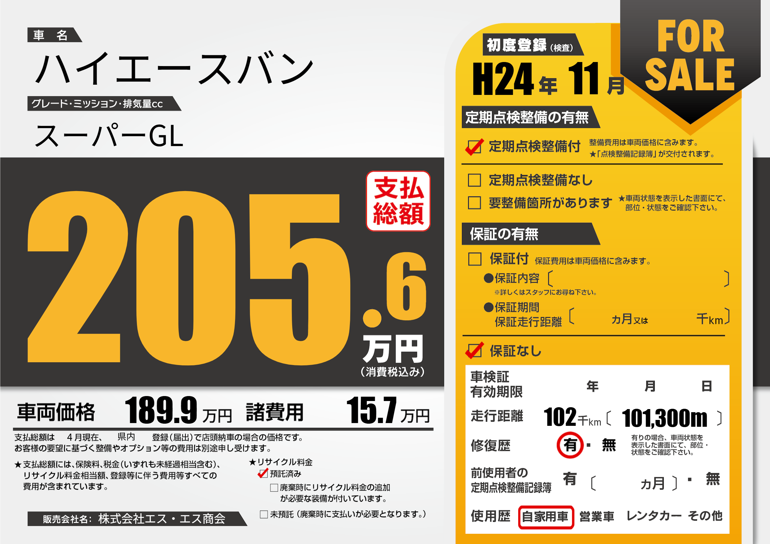 | 走行キロ | 10.2万km | 初年度登録 | H24年11月 |