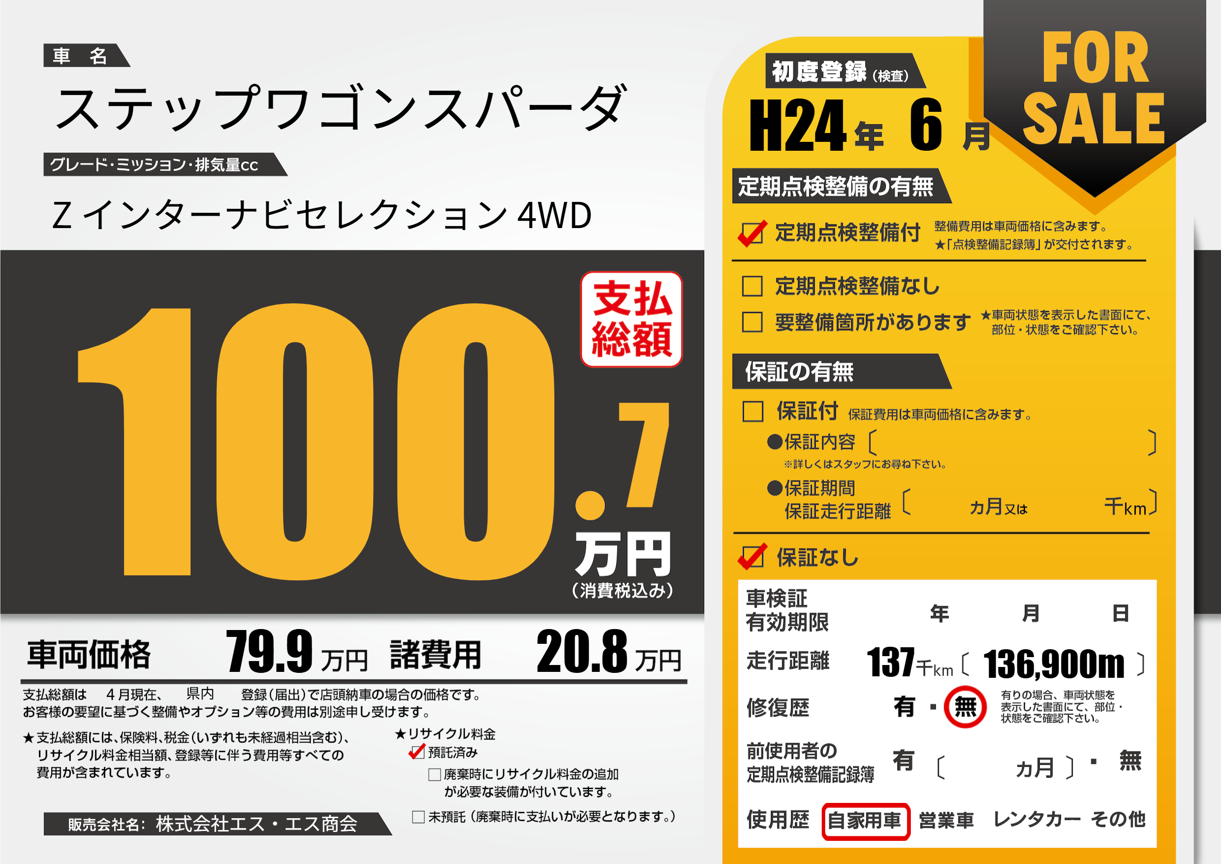| 走行キロ | 13.7万km | 初年度登録 | H24年6月 |