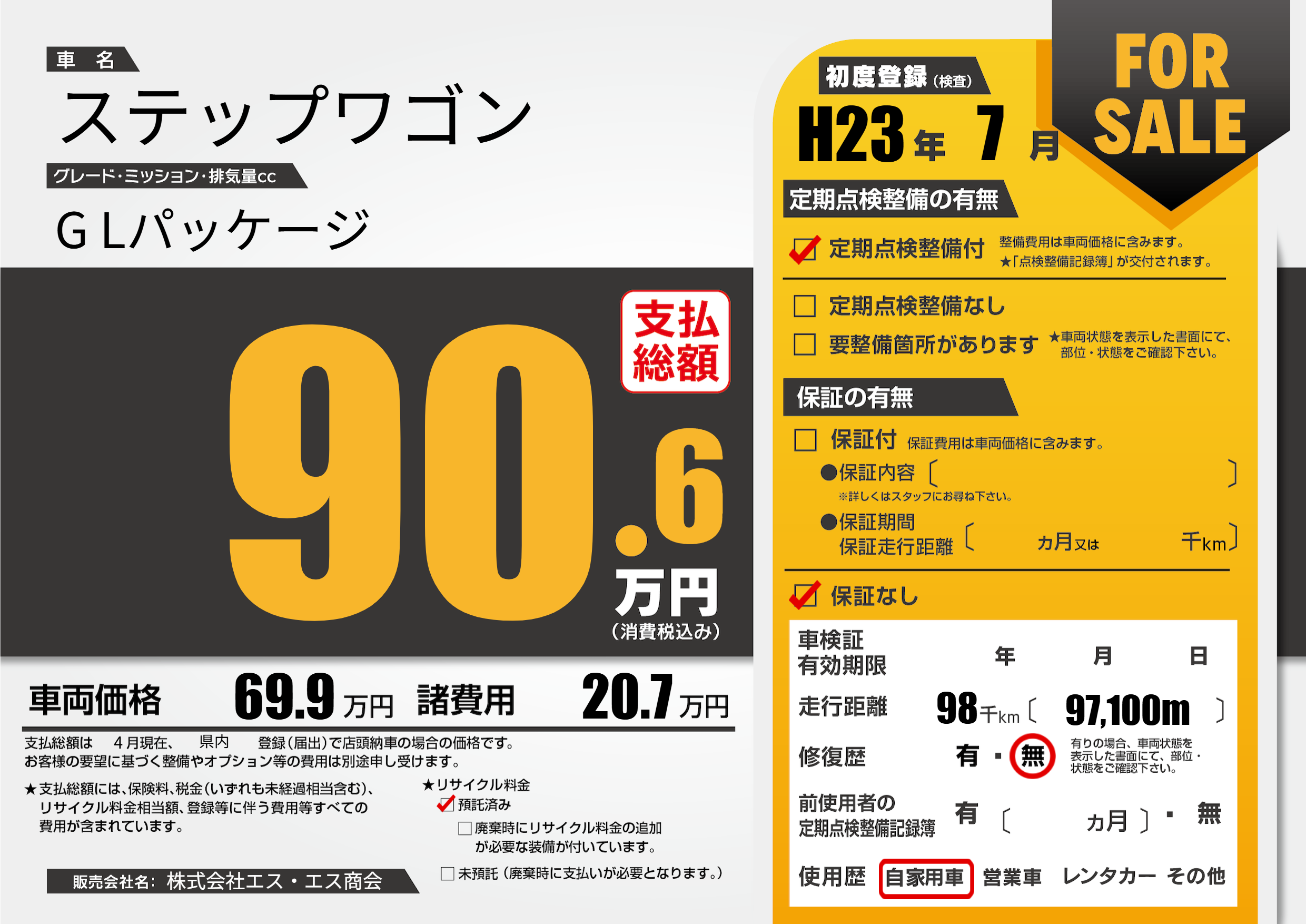 | 走行キロ | 9.8万km | 初年度登録 | H23年7月 |