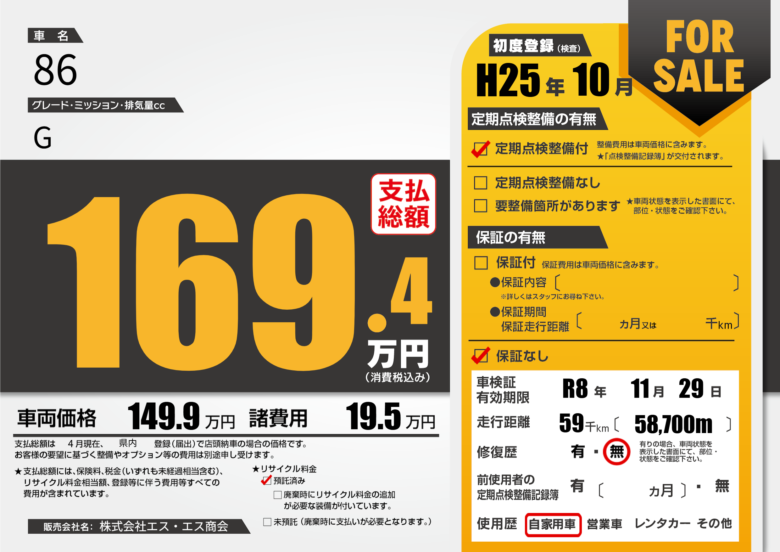 | 走行キロ | 5.9万km | 初年度登録 | H25年10月 |