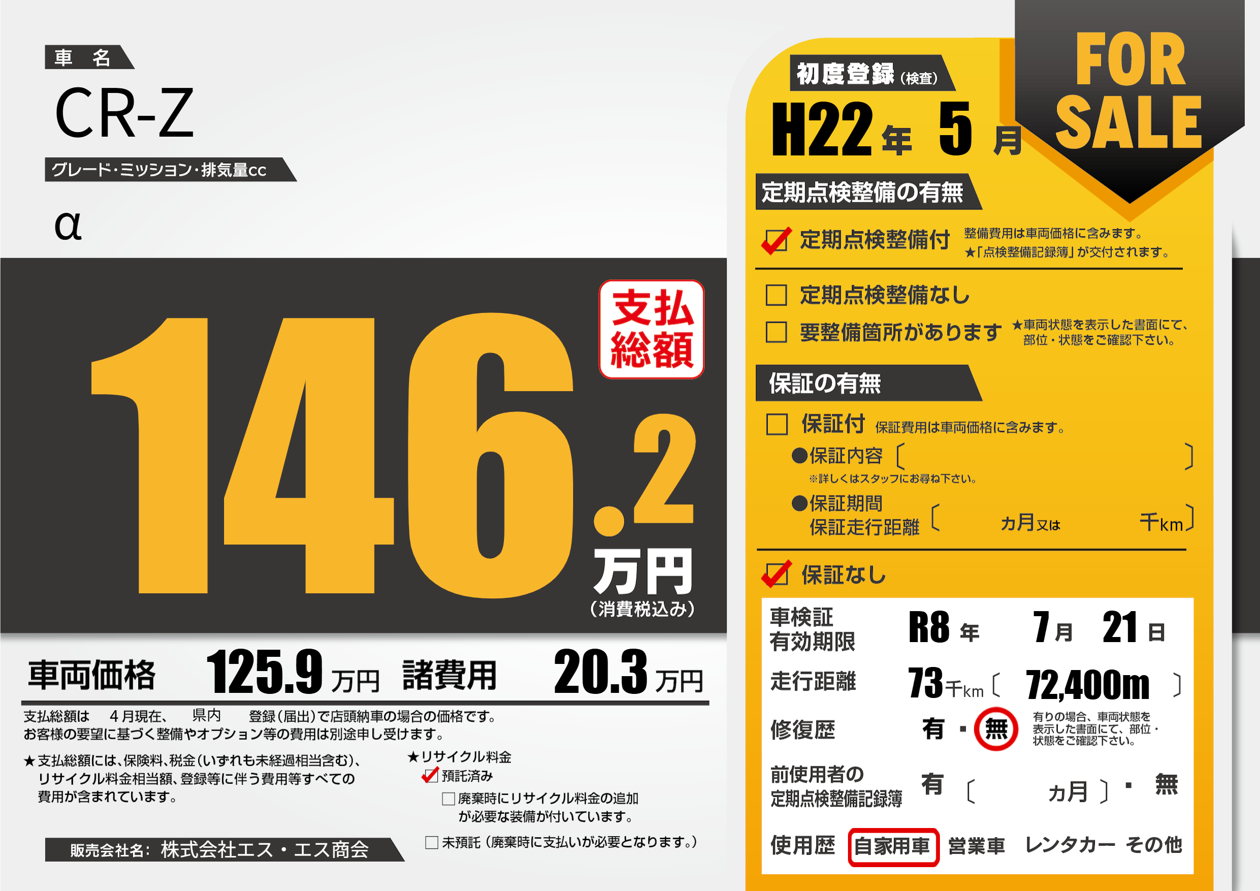 | 走行キロ | 7.3万km | 初年度登録 | H22年5月 |