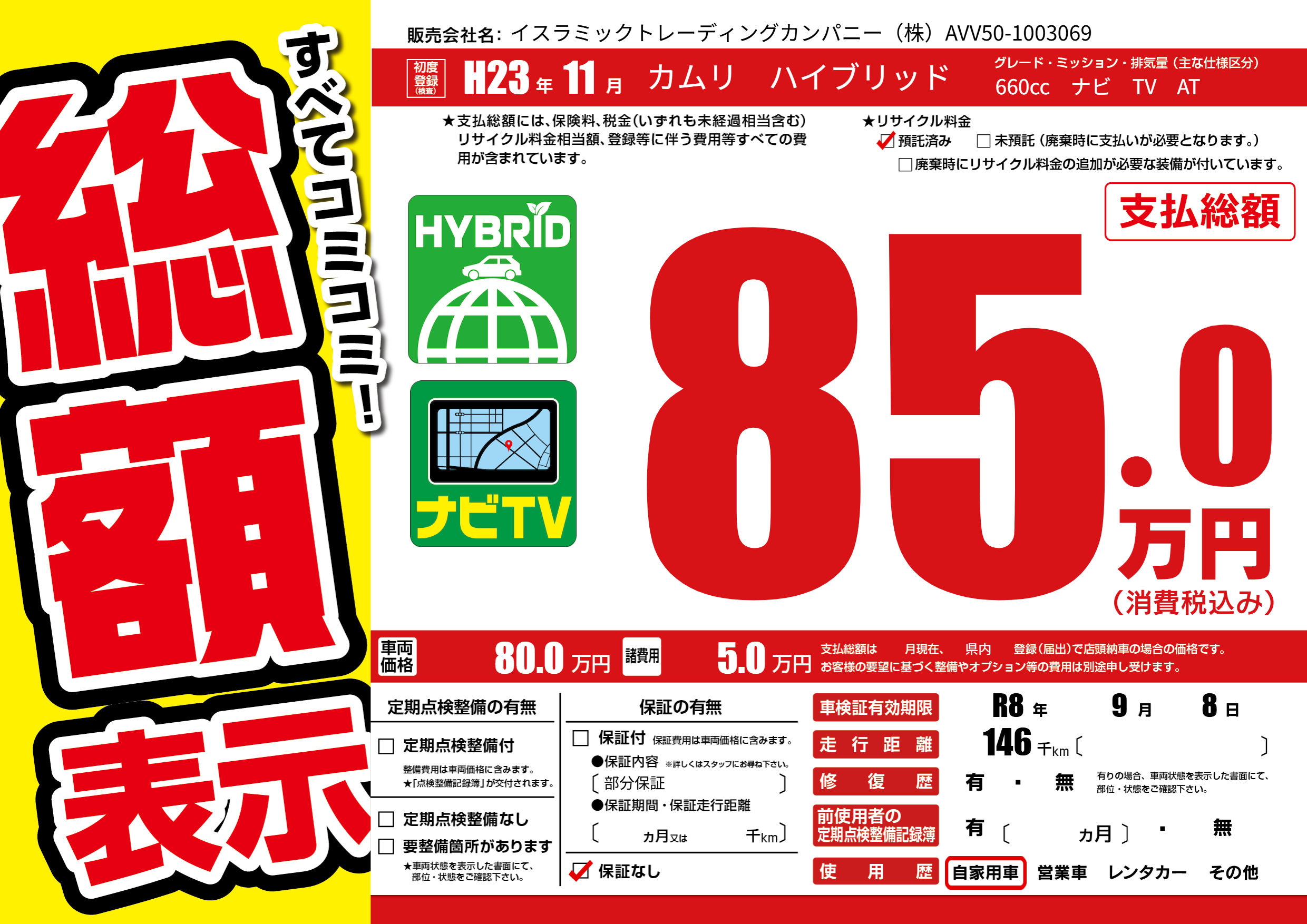 | 車名 | カムリ ハイブリッド | グレード ミッション 排気量 |