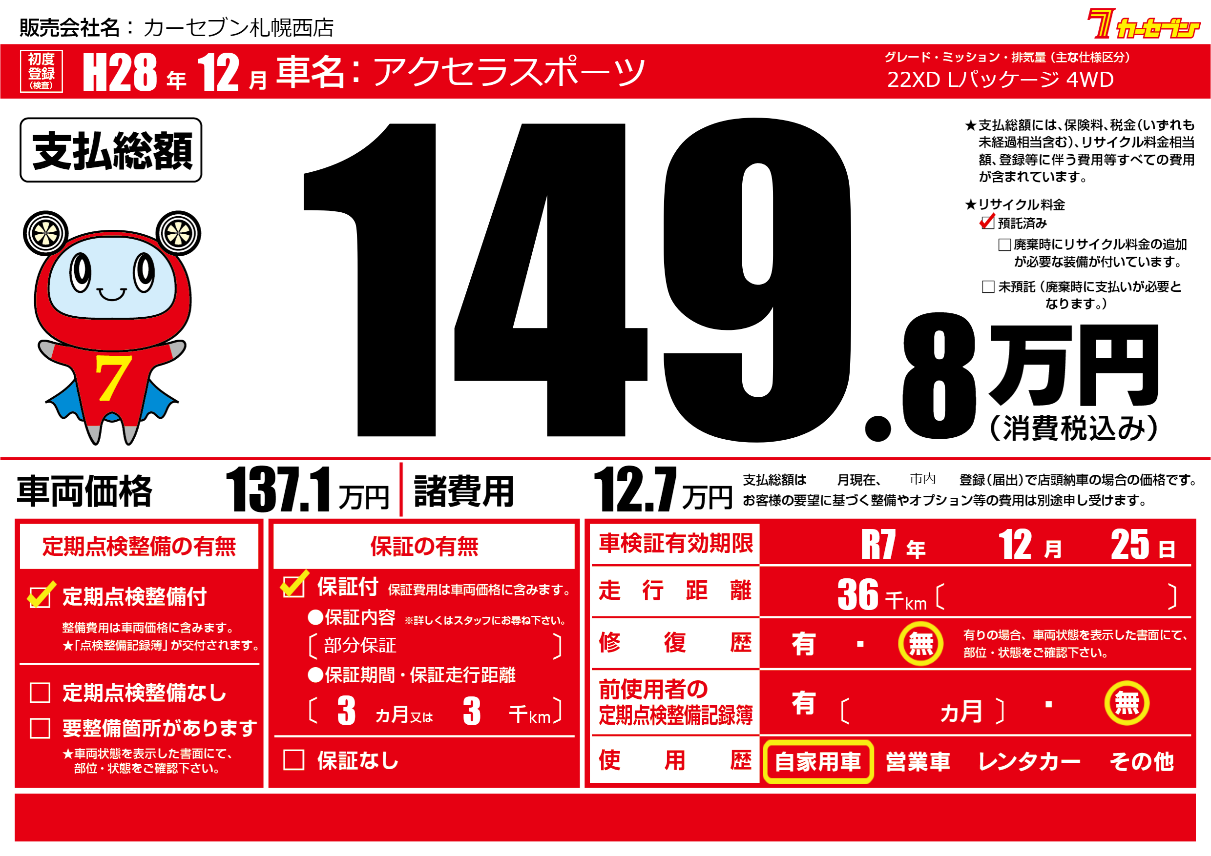 | 走行キロ | 3.6万km | 初年度登録 | H28年12月 |