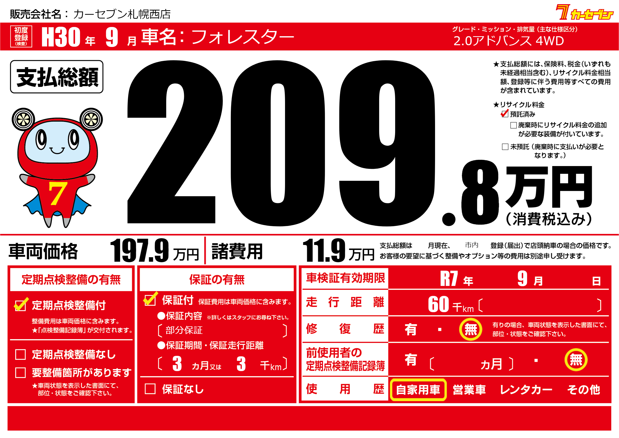 | 車名 | フォレスター | グレード ミッション 排気量 |