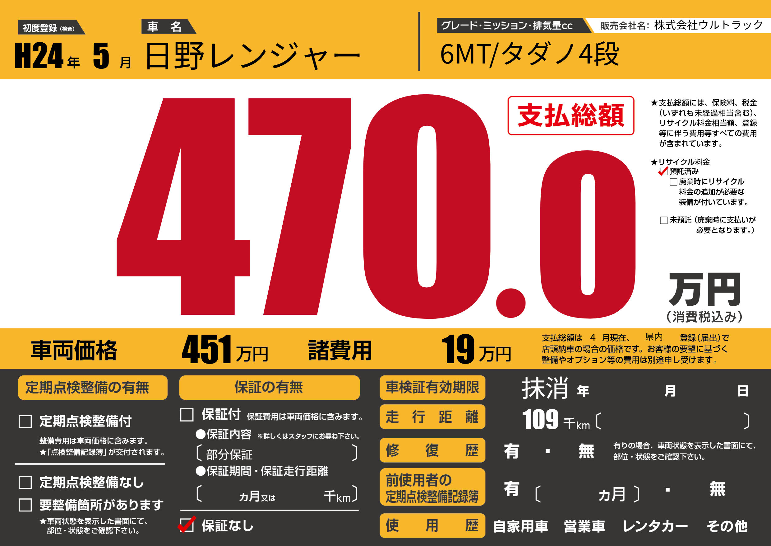 | 走行キロ | 10.9万km | 初年度登録 | H24年5月 |