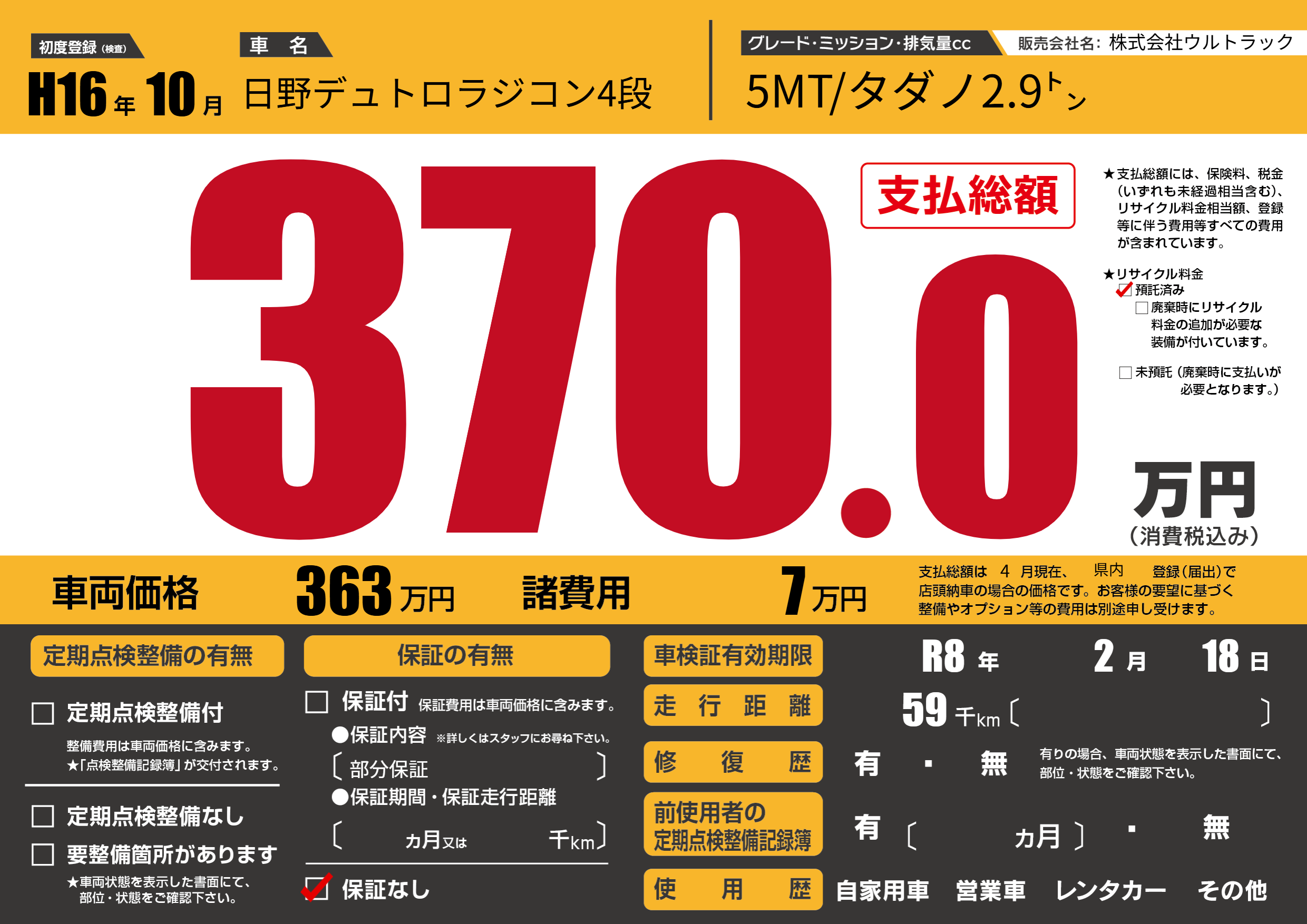 | 車名 | 日野デュトロラジコン4段 | グレード ミッション 排気量 |