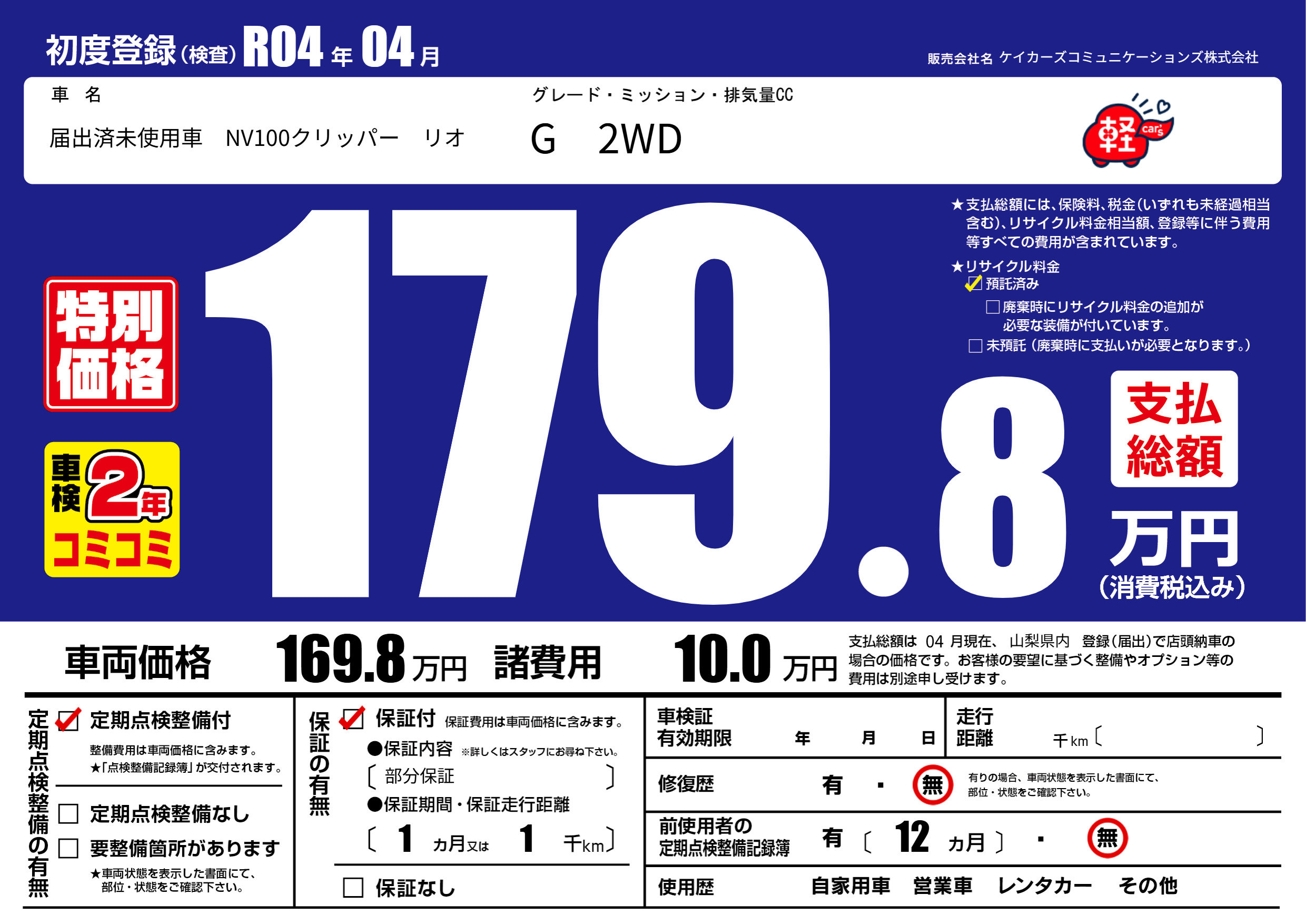 | 車名 | 届出済未使用車 NV100クリッパー リオ | グレード ミッション 排気量 |