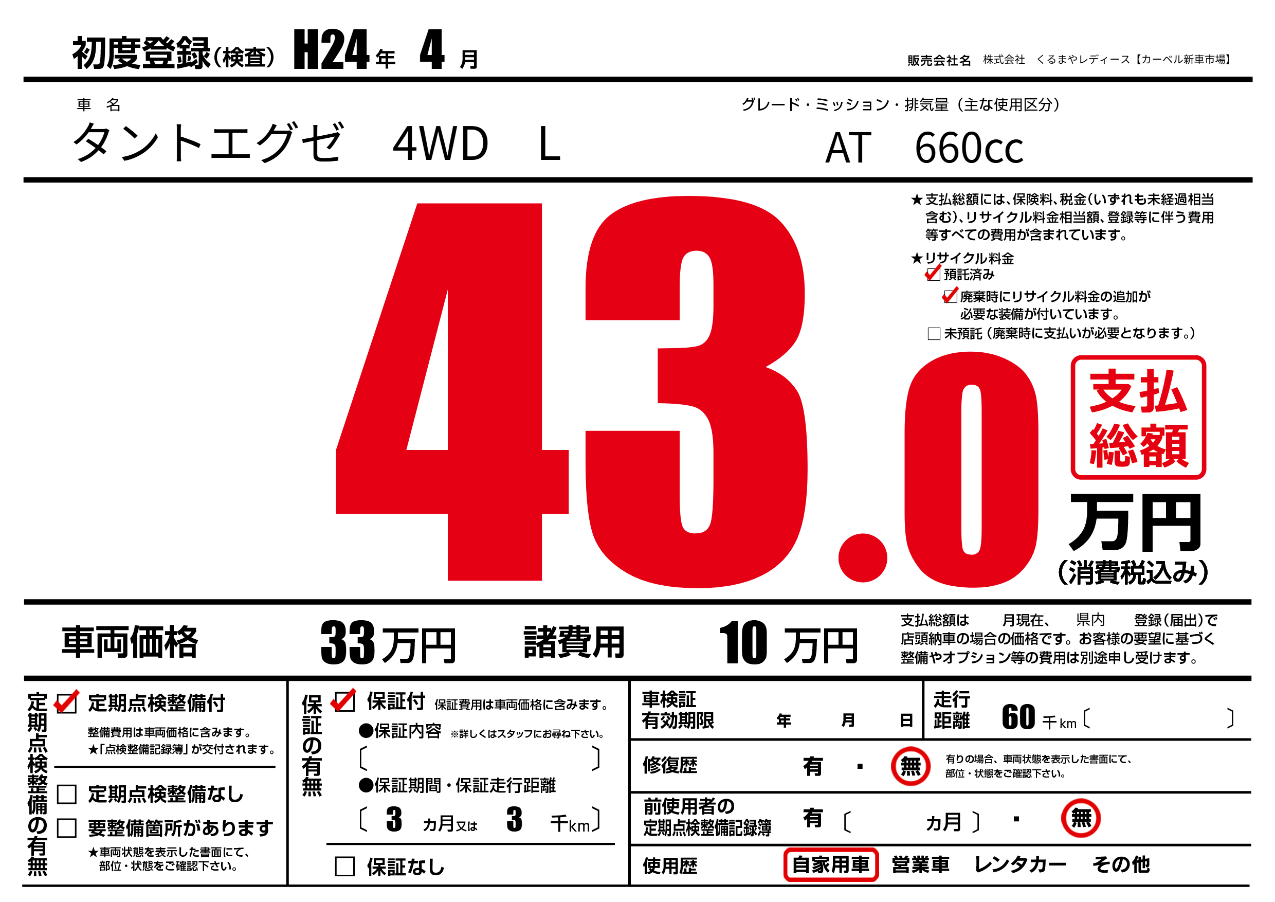 | 車名 | タントエグゼ 4WD L | グレード ミッション 排気量 |