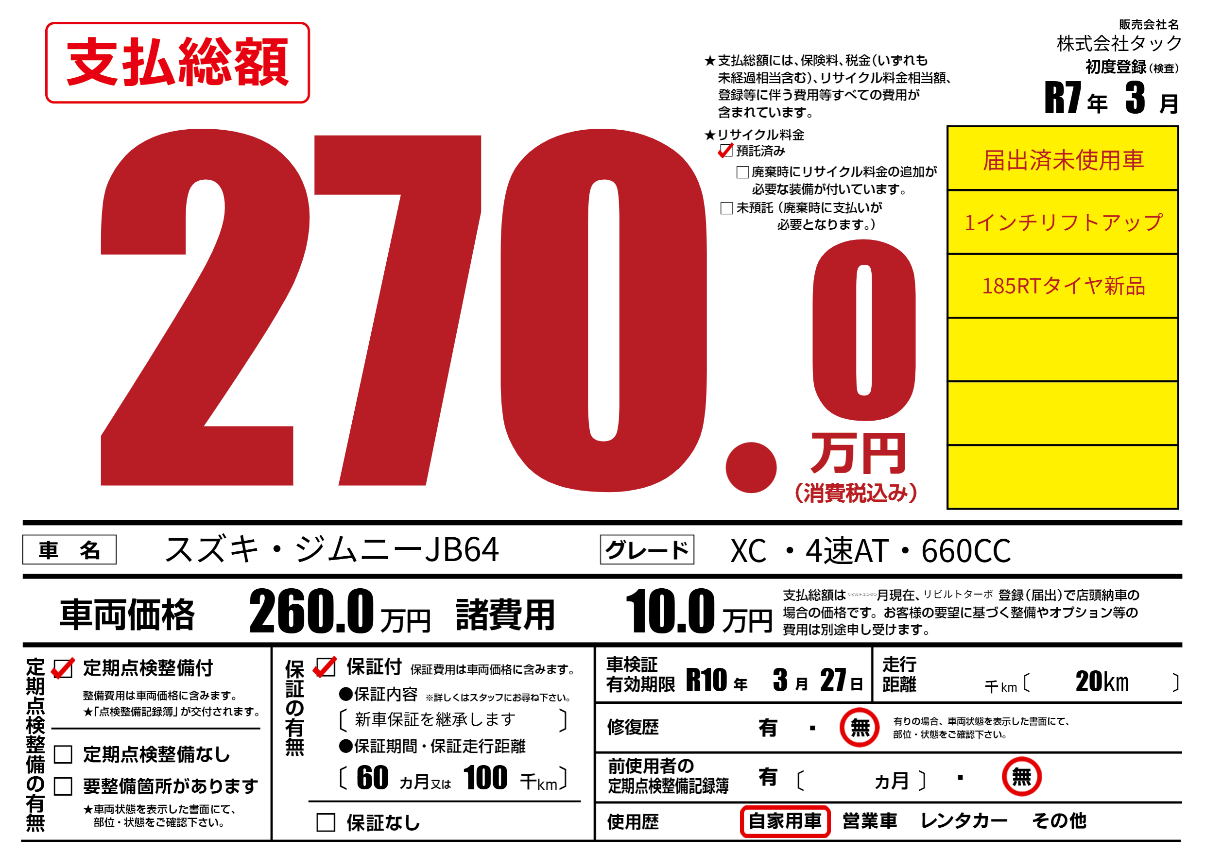| 車名 | スズキ・ジムニーJB64 | グレード ミッション 排気量 |
