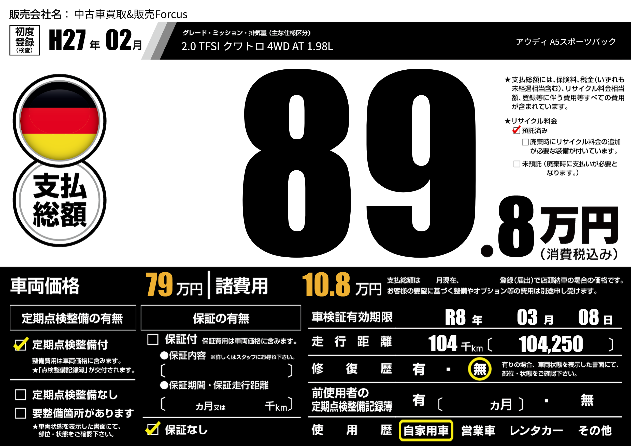 | 車名 | アウディ A5スポーツバック | グレード ミッション 排気量 |