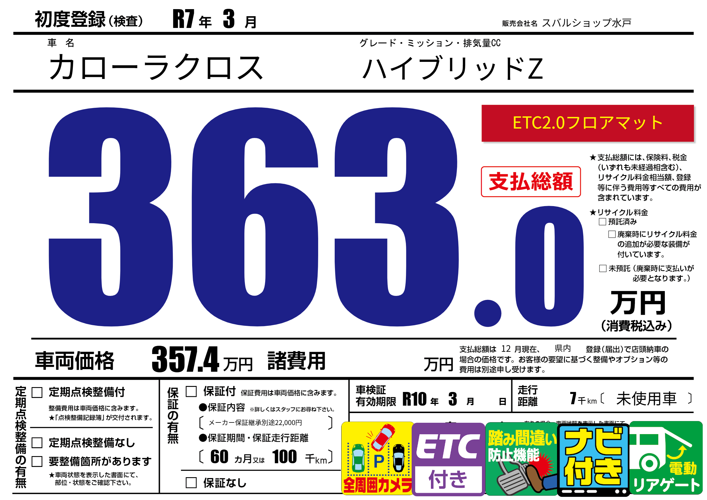 | 走行キロ | 0.7万km | 初年度登録 | R7年3月 |