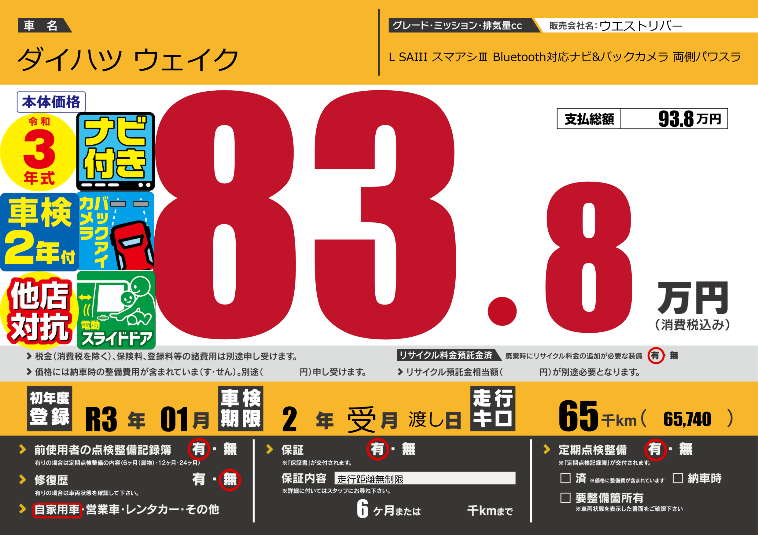 | 車名 | ダイハツ ウェイク | グレード ミッション 排気量 |