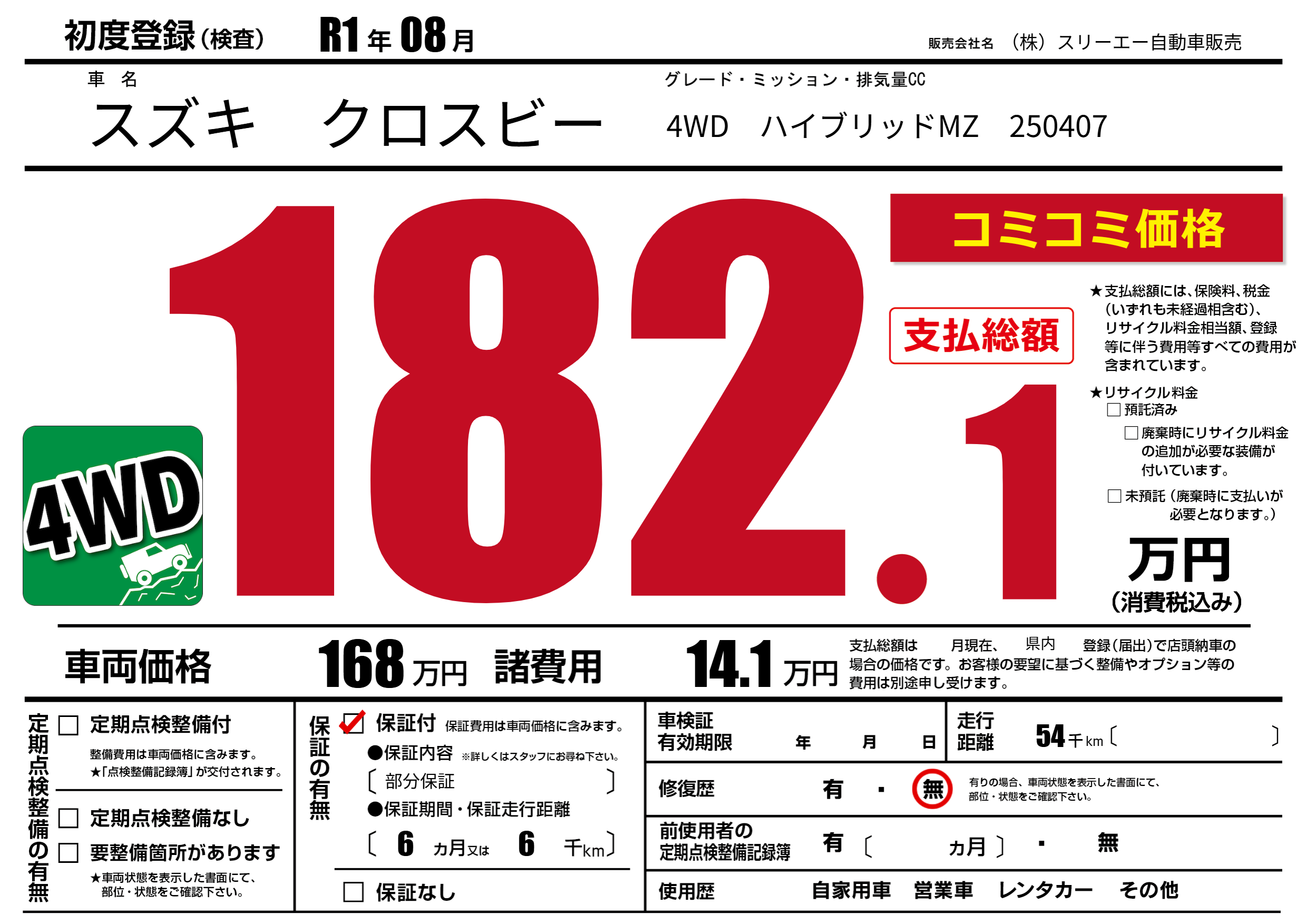 保証付き 保証内容(部分保証) 6ヶ月または(6)千kmまで |