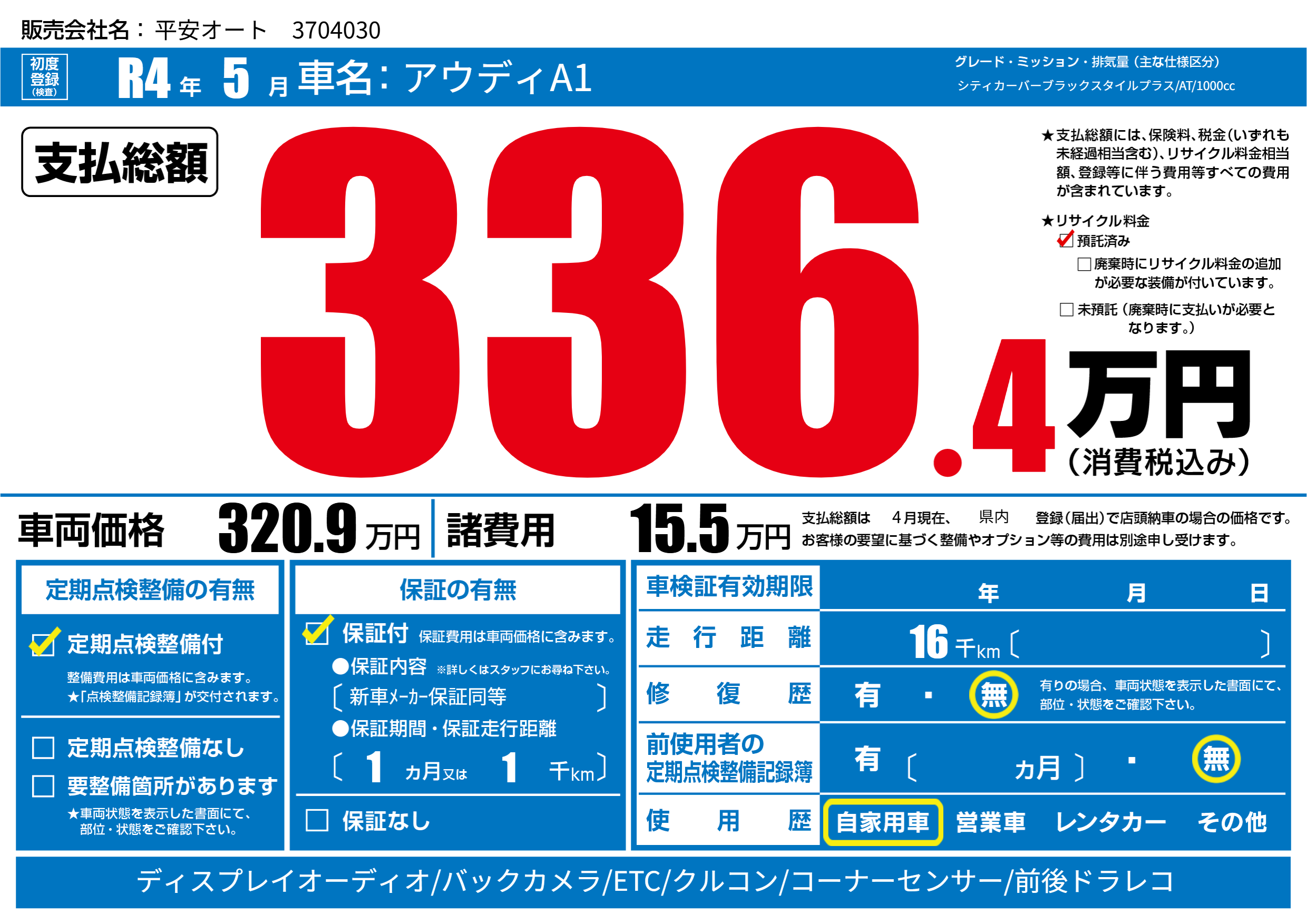 あり | リサイクル預託金相当額 | ( 0円)が別途必要 |