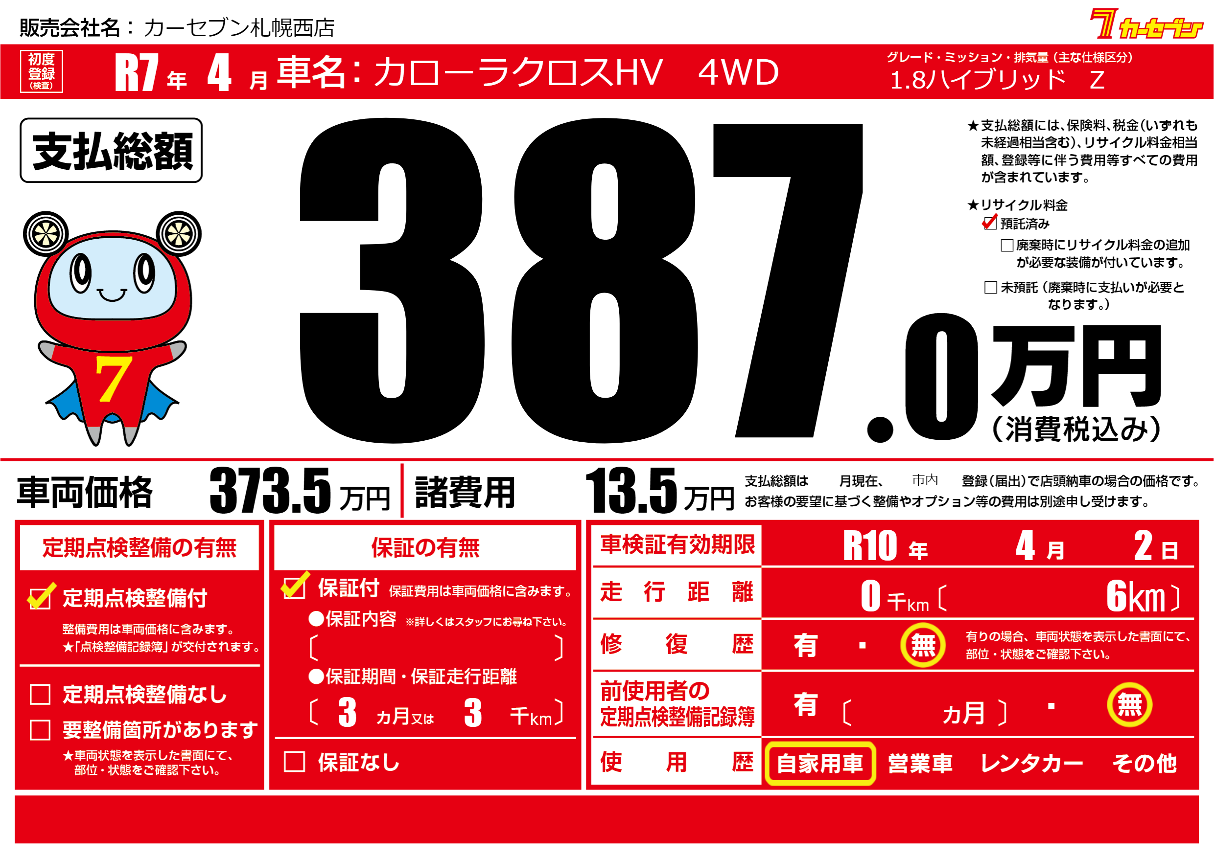 | 初年度登録 | R7年4月 | ||