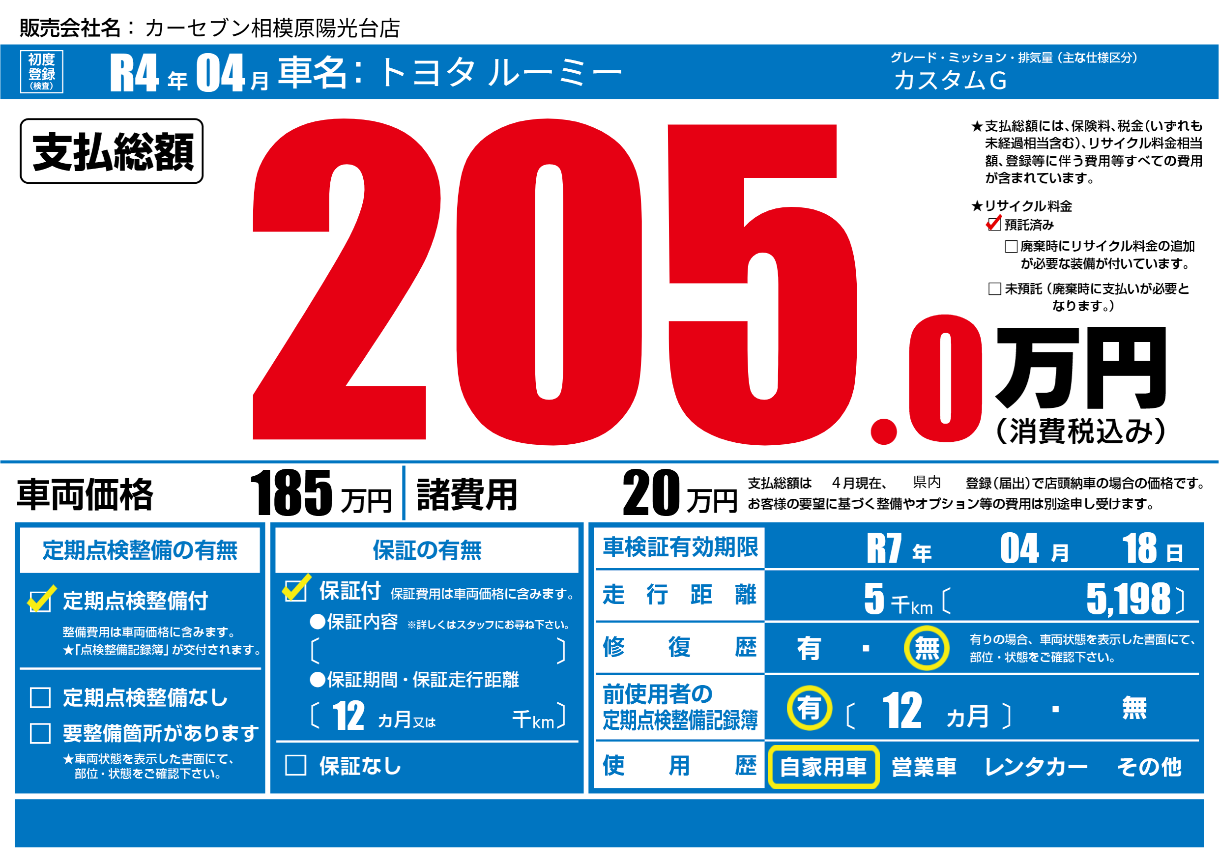 | 車検制限 | R7年 04月 18日 | ||