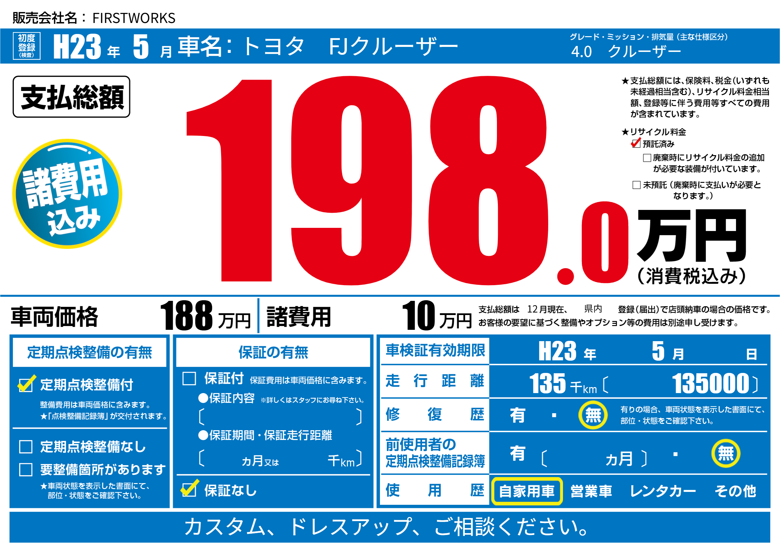 | 車名 | トヨタ FJクルーザー | グレード ミッション 排気量 |