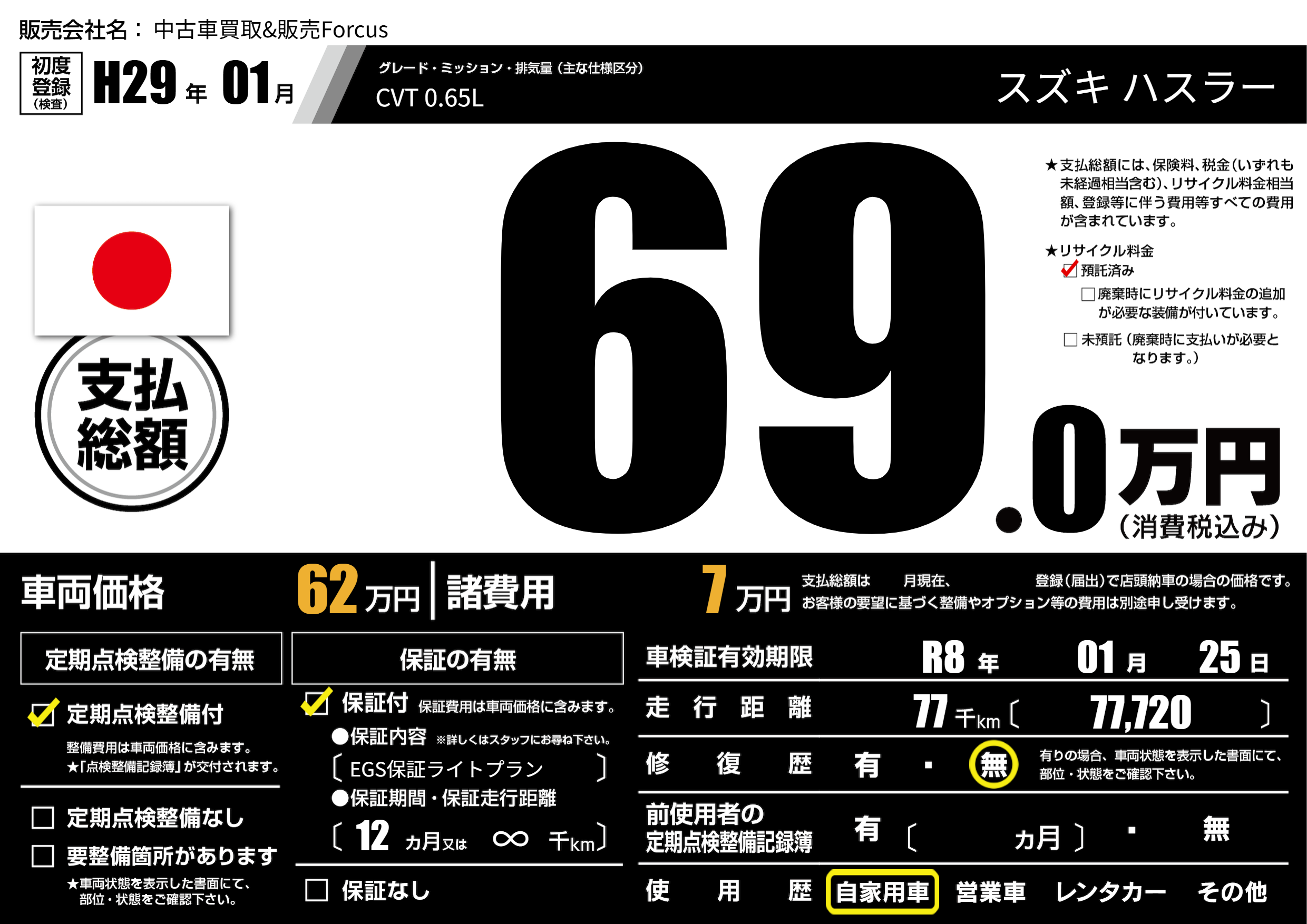 | 走行キロ | 7.7万km | 初年度登録 | H29年01月 |