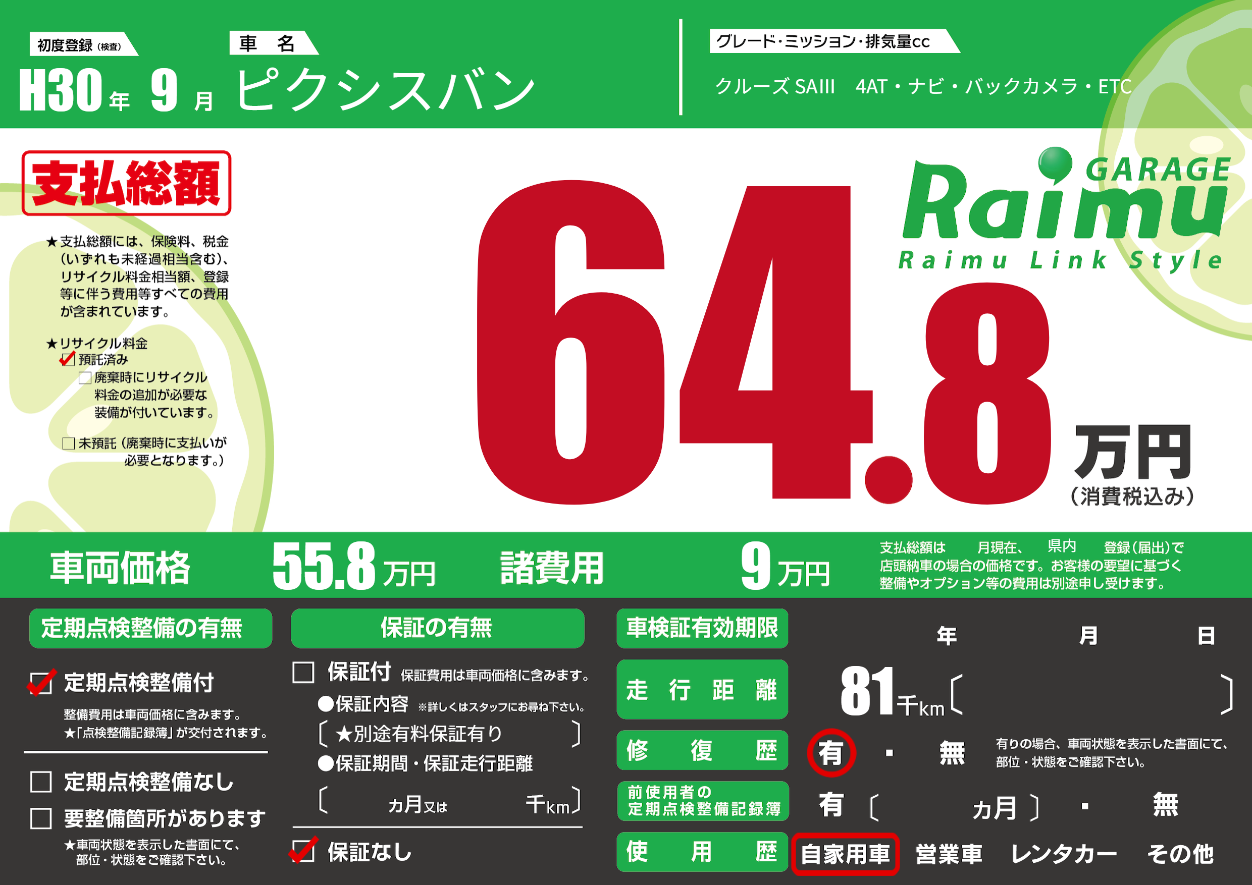 保証なし 保証内容(★別途有料保証有り) ---ヶ月または()千kmまで |