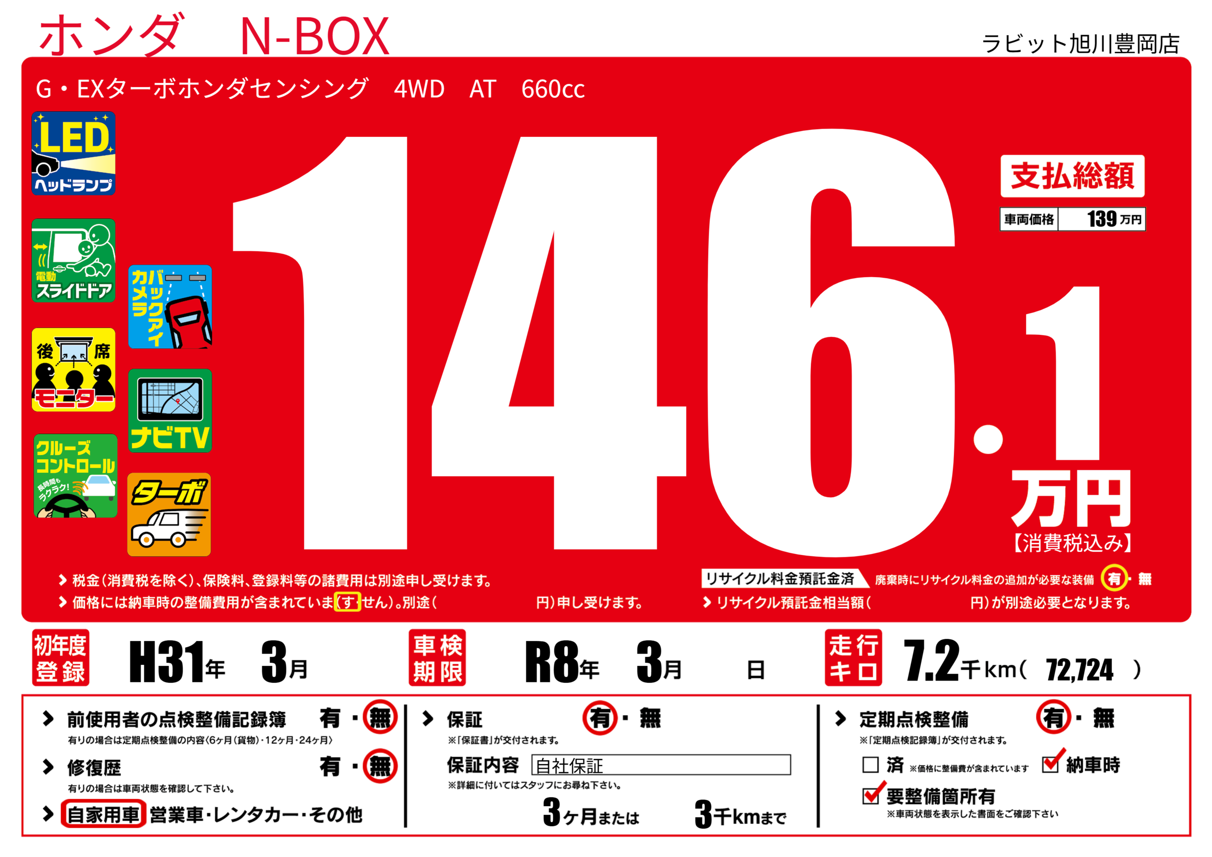 | 車名 | ホンダ N-BOX | グレード ミッション 排気量 |