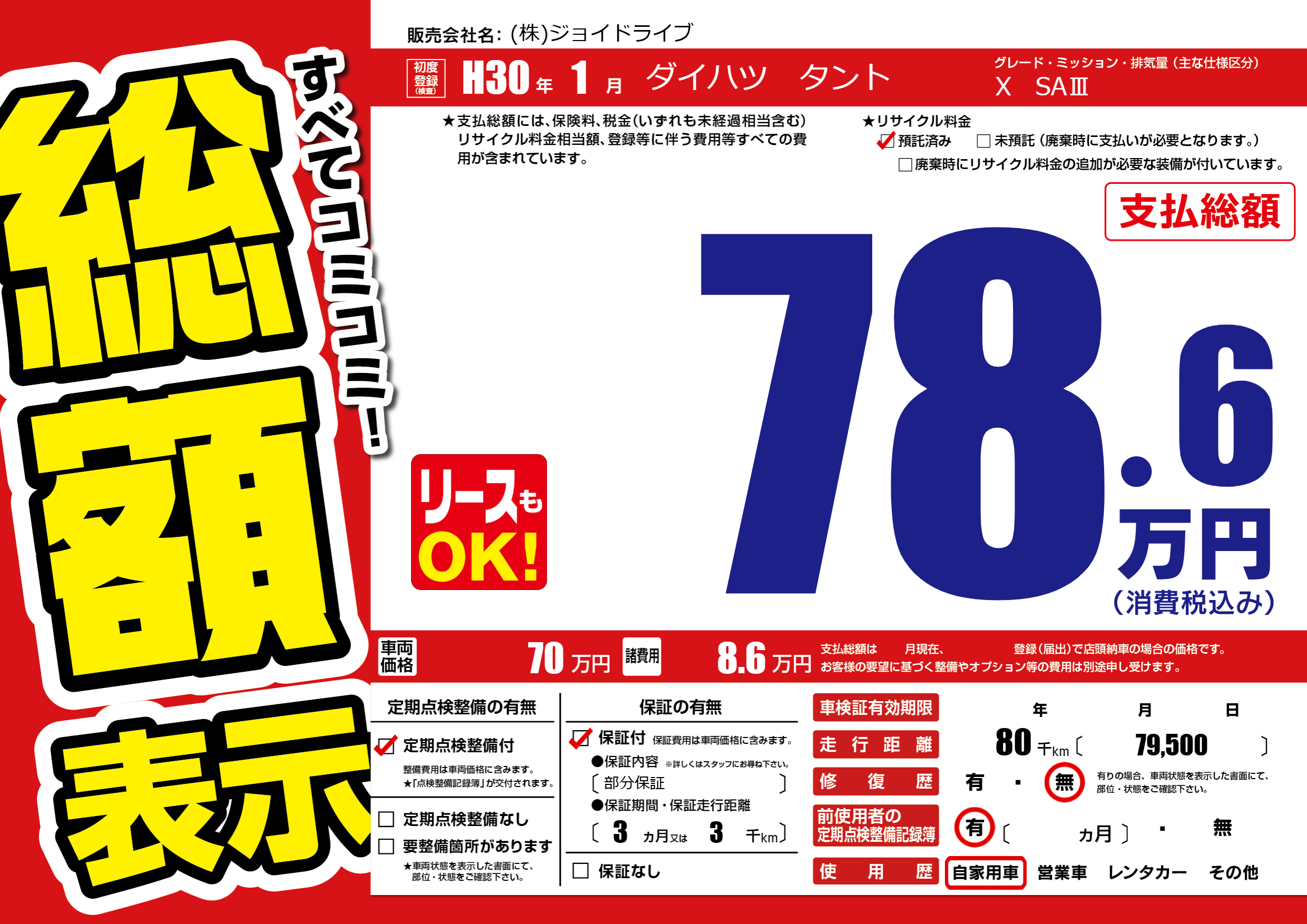 | 車名 | ダイハツ タント | グレード ミッション 排気量 |
