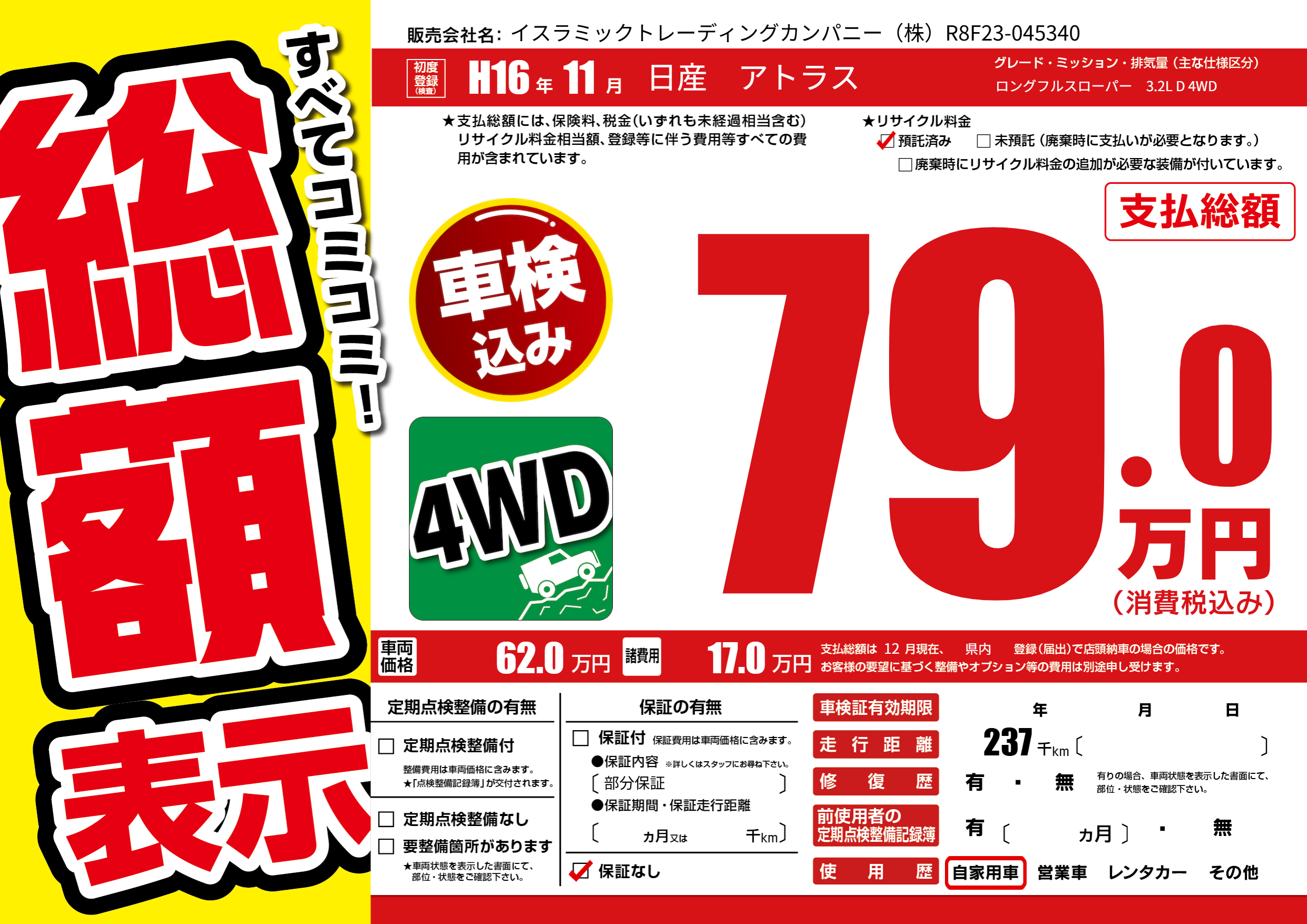 | 車名 | 日産 アトラス | グレード ミッション 排気量 |