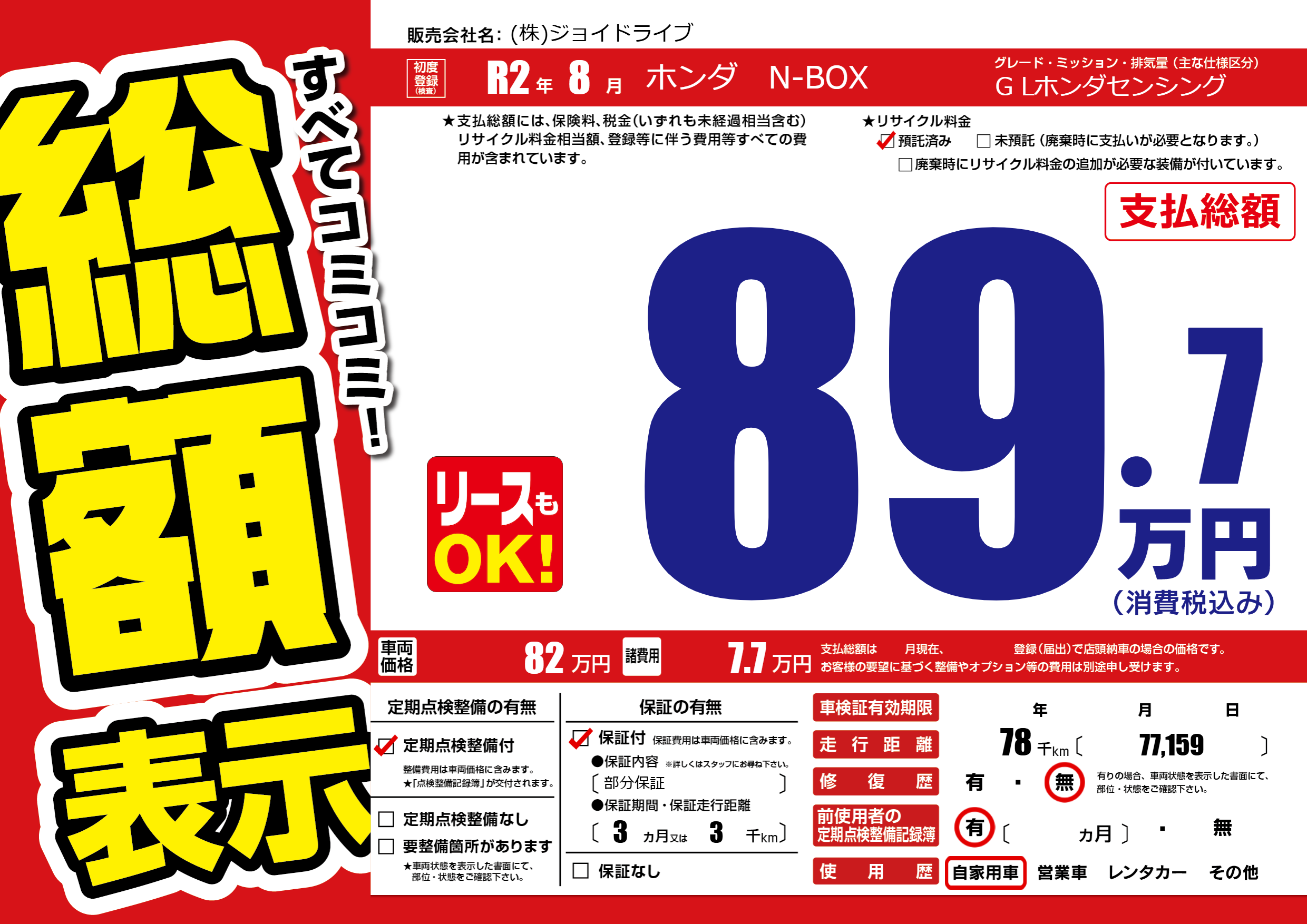 | 車名 | ホンダ N-BOX | グレード ミッション 排気量 |