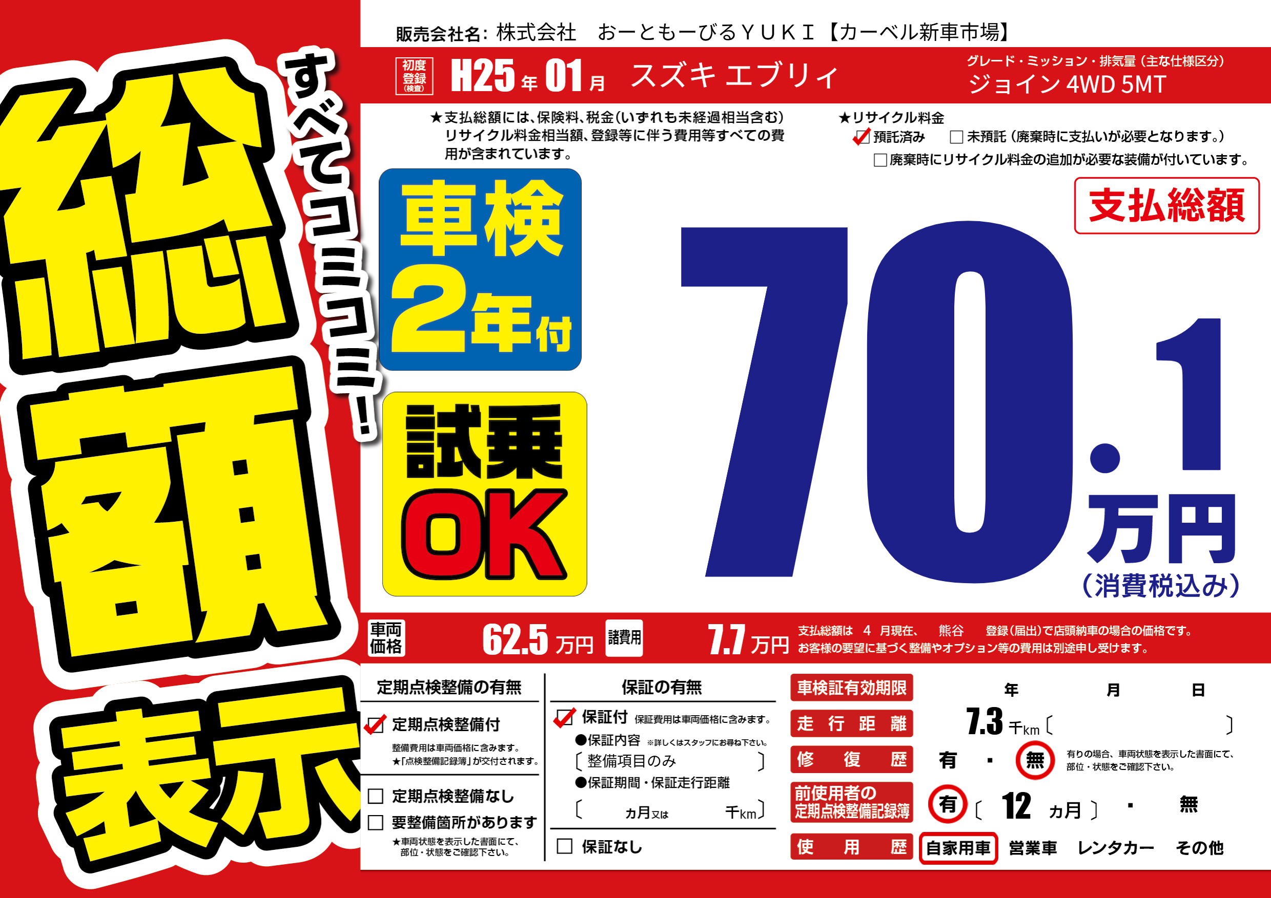 | 車名 | スズキ エブリィ | グレード ミッション 排気量 |