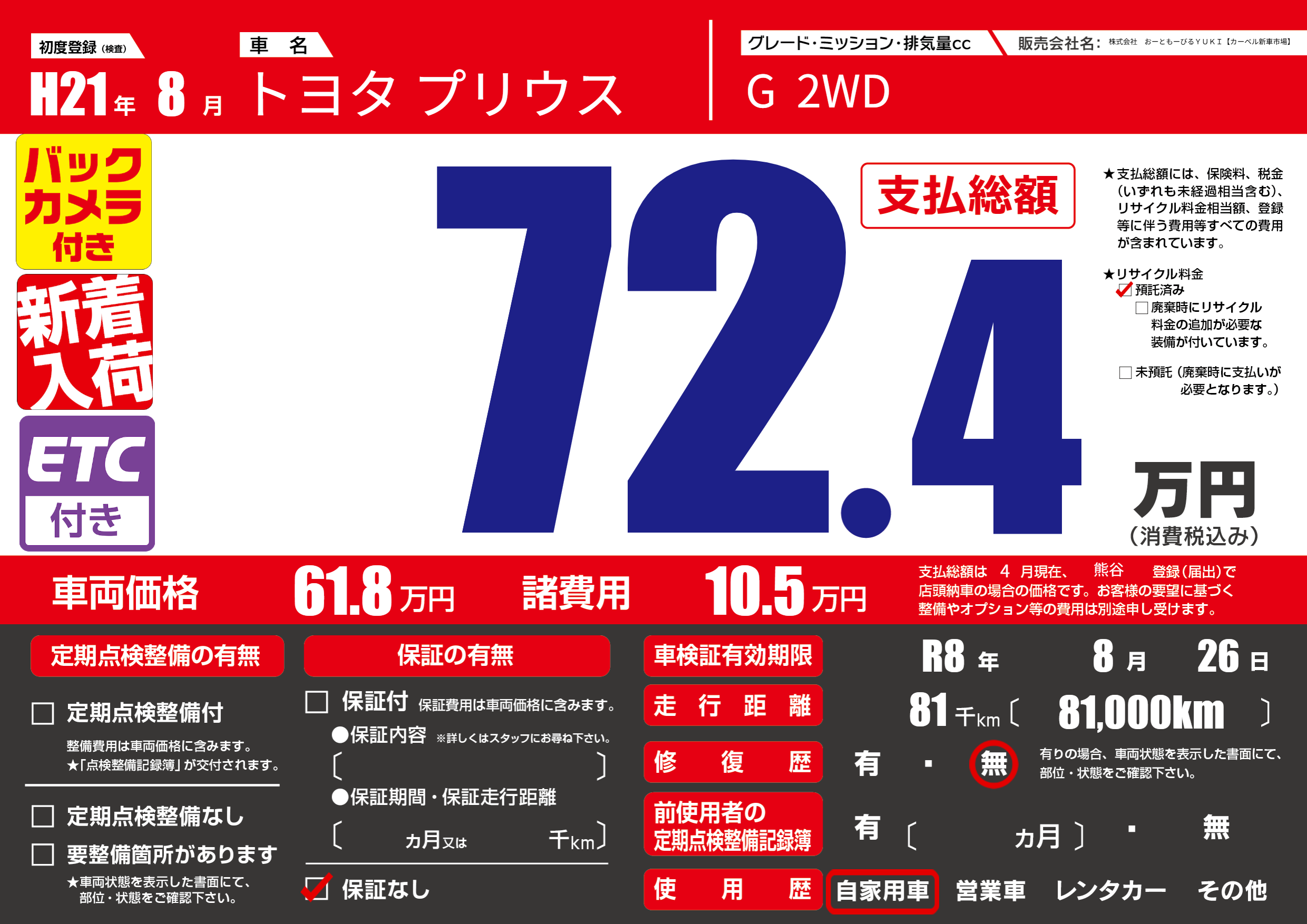 | 走行キロ | 8.1万km | 初年度登録 | H21年8月 |