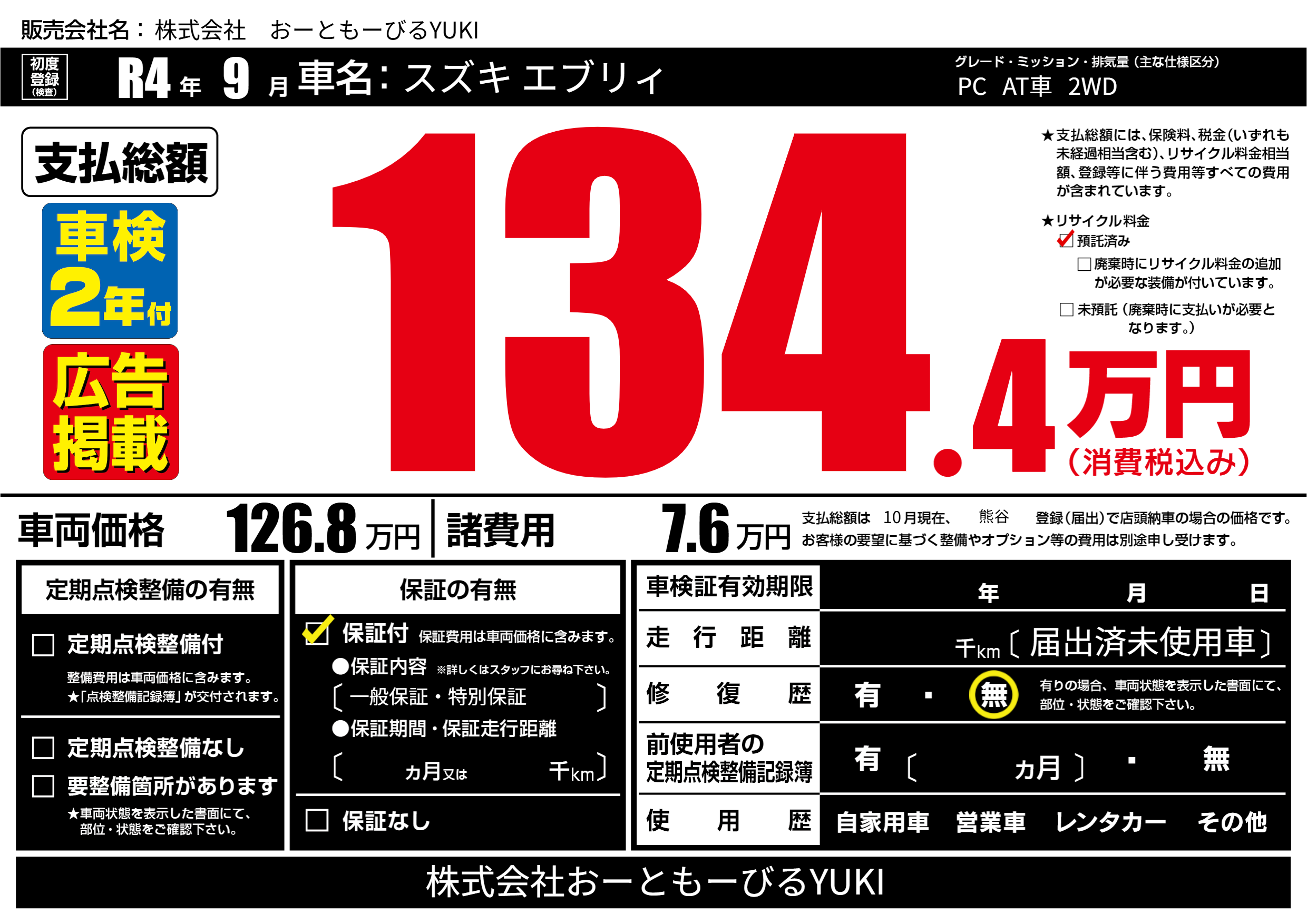 保証付き 保証内容(一般保証・特別保証) ---ヶ月または()千kmまで |