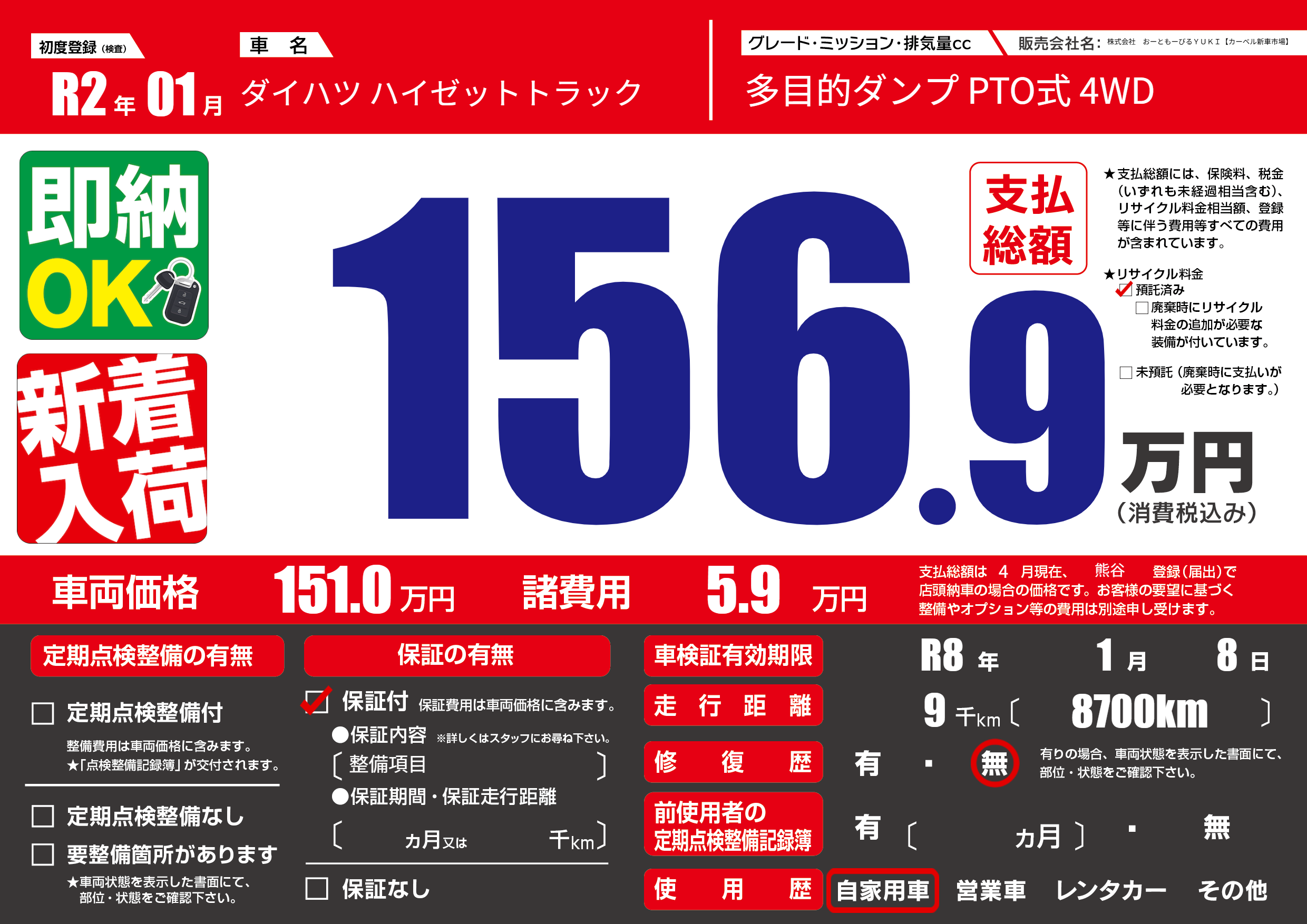 | 走行キロ | 0.9万km | 初年度登録 | R2年01月 |