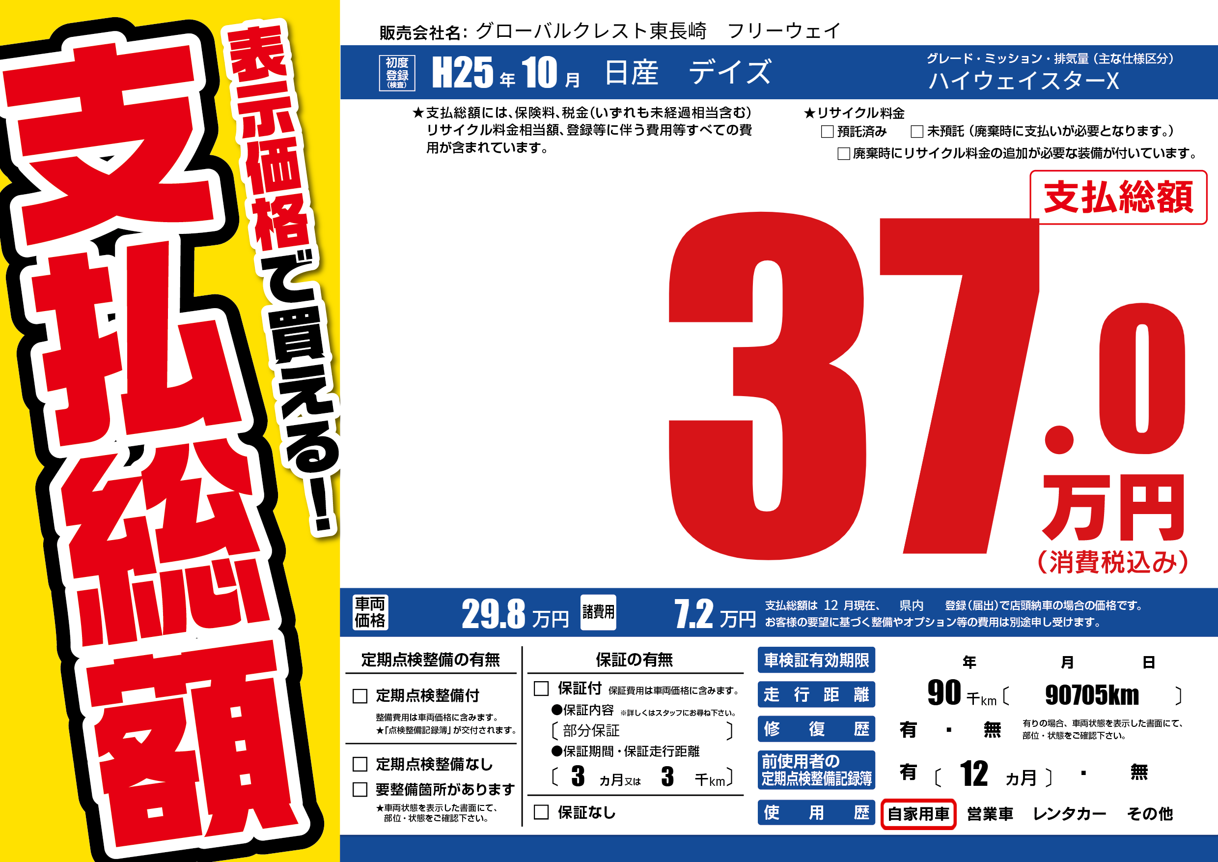 | 走行キロ | 9万km | 初年度登録 | H25年10月 |