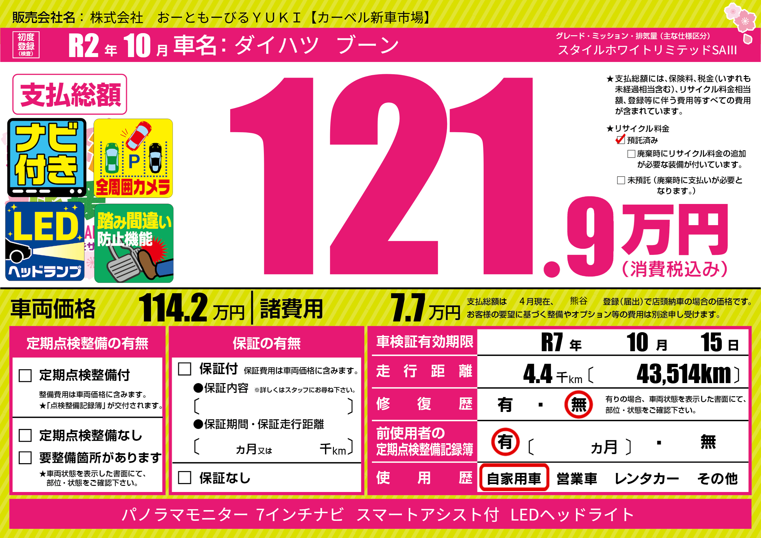 | 車検制限 | R7年 10月 15日 | ||