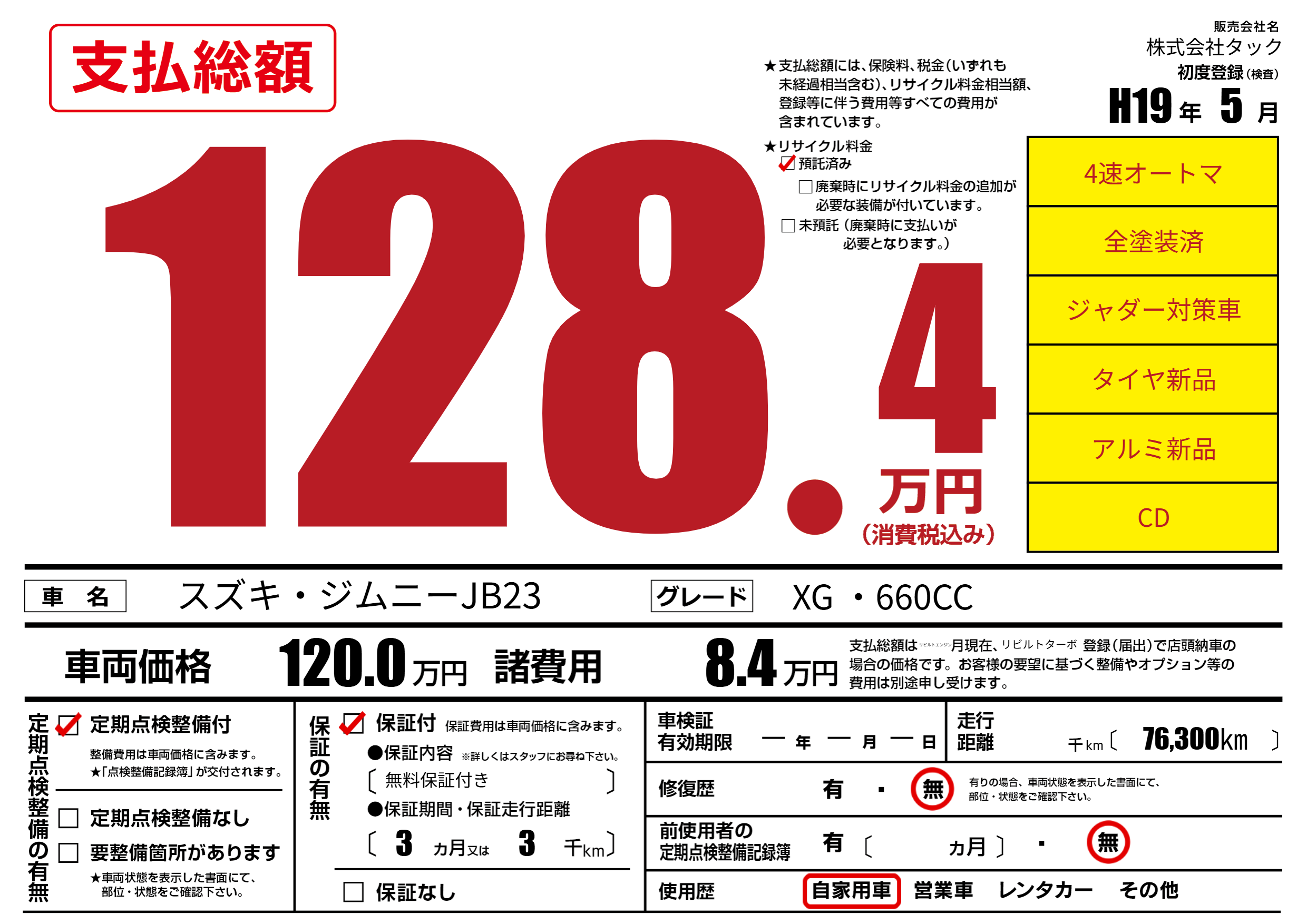 保証なし 保証内容(無料保証付き) 3ヶ月または(3)千kmまで |