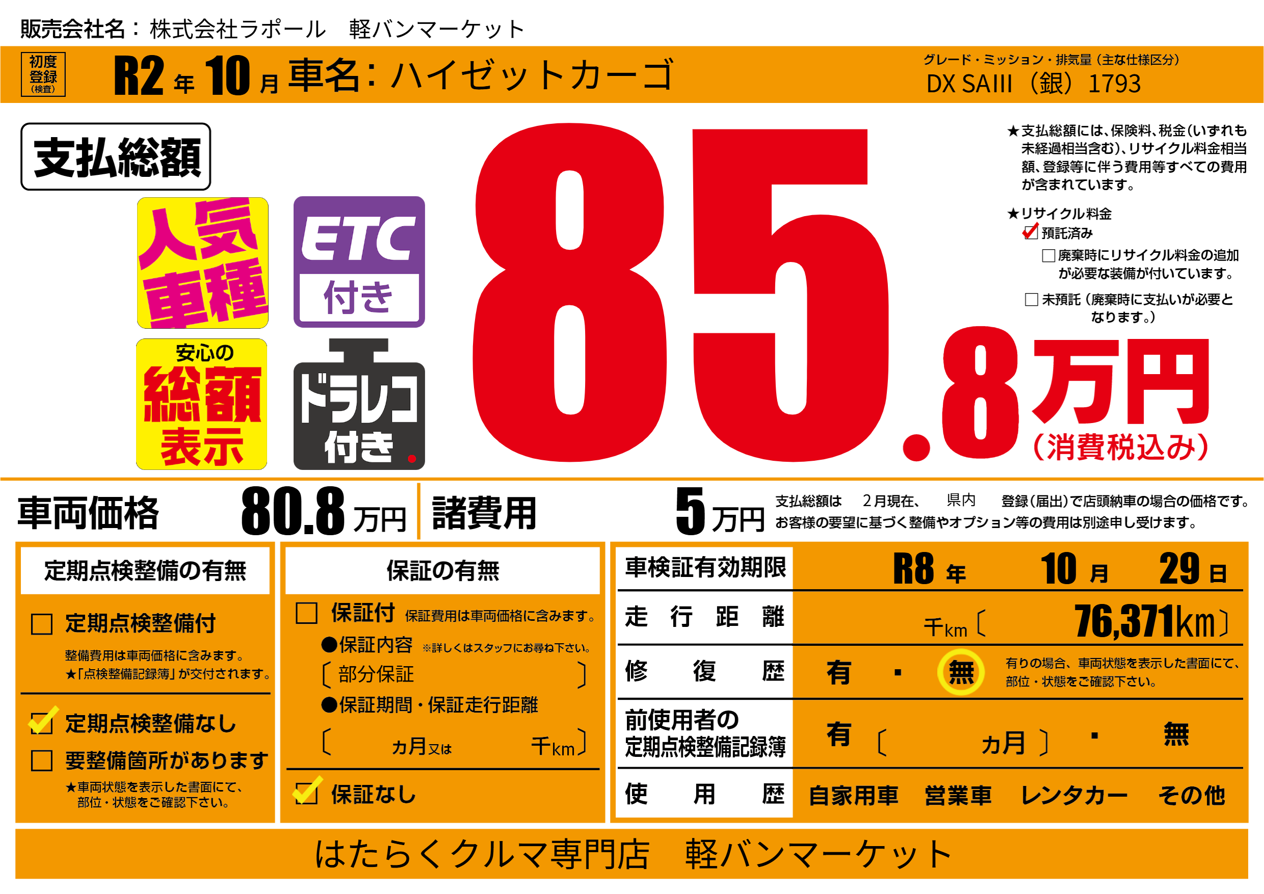 | 車名 | ハイゼットカーゴ | グレード ミッション 排気量 |
