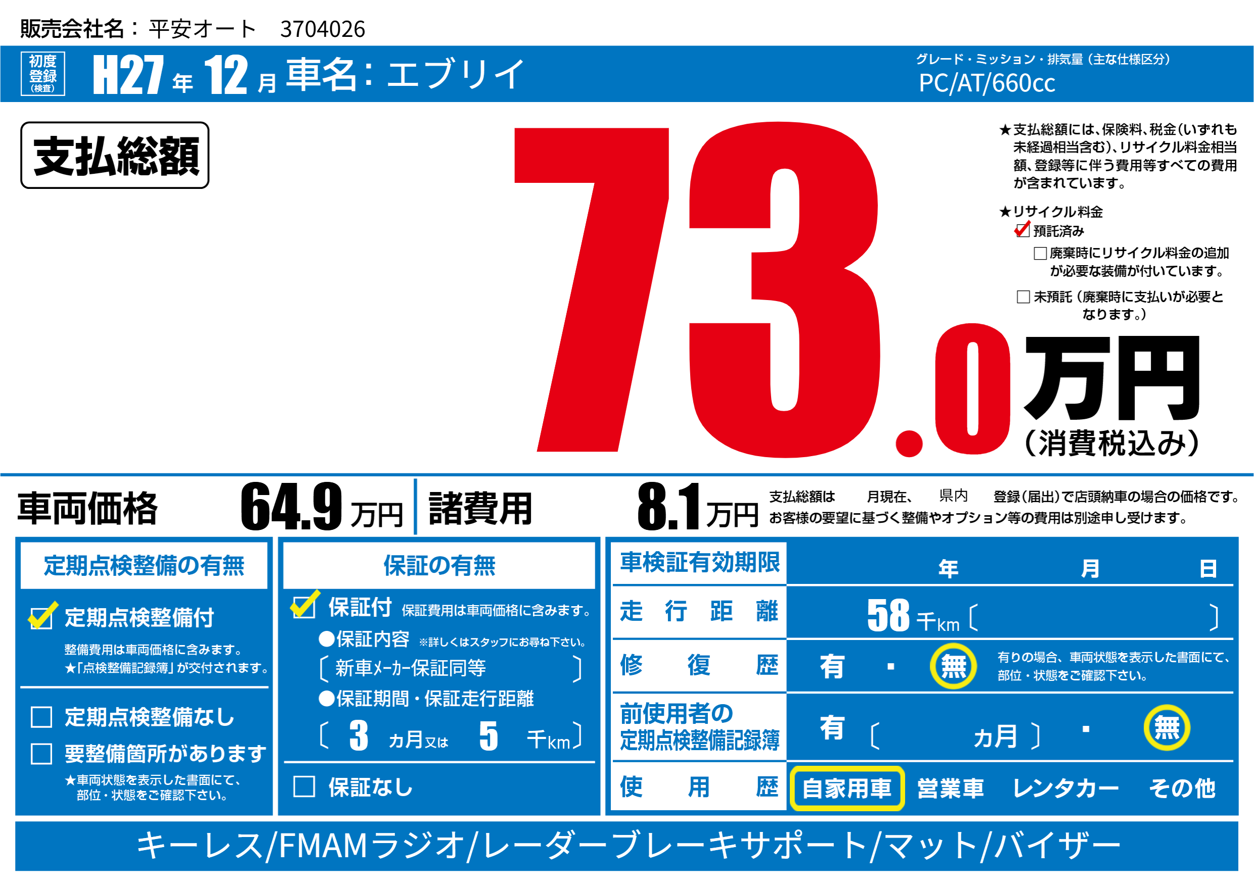 | 車名 | エブリイ | グレード ミッション 排気量 |