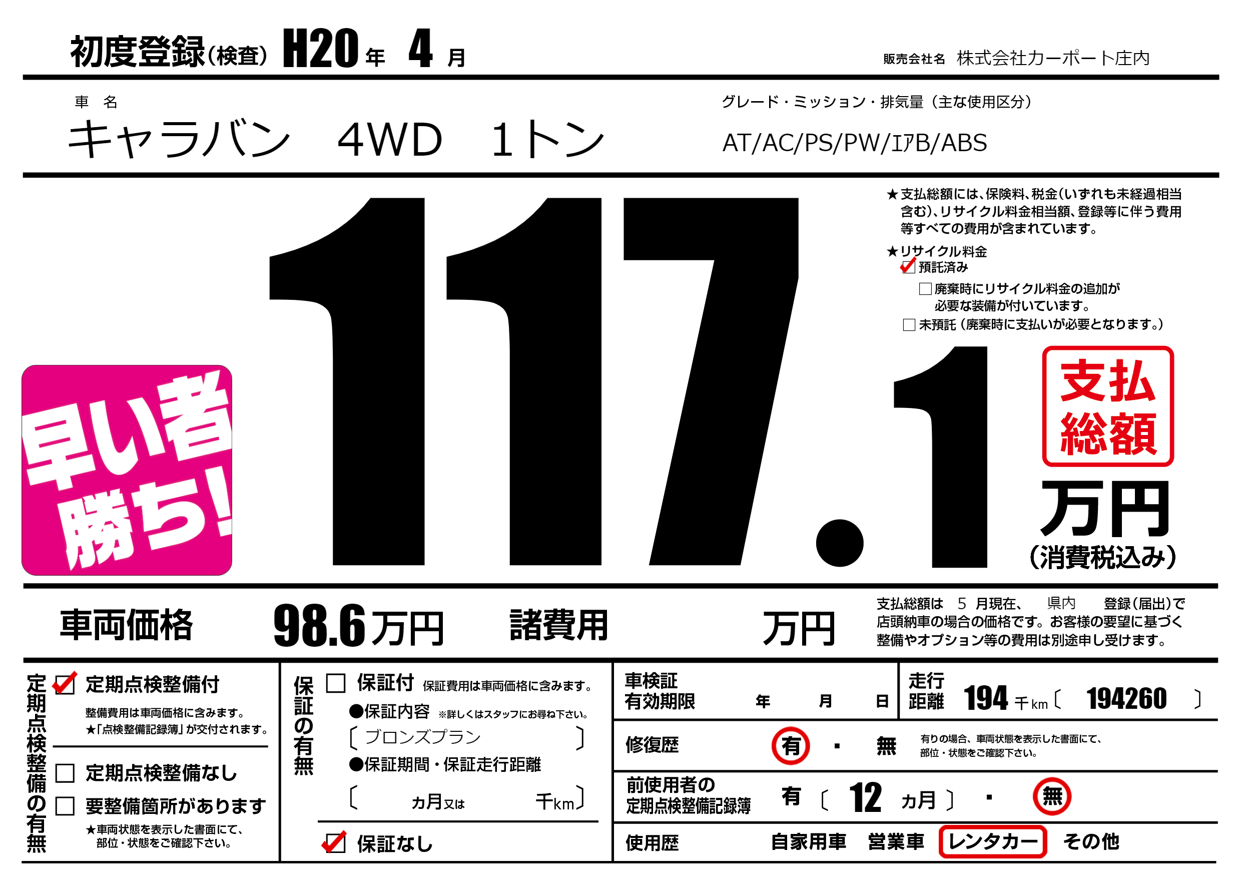 | 車名 | キャラバン 4WD 1トン | グレード ミッション 排気量 |