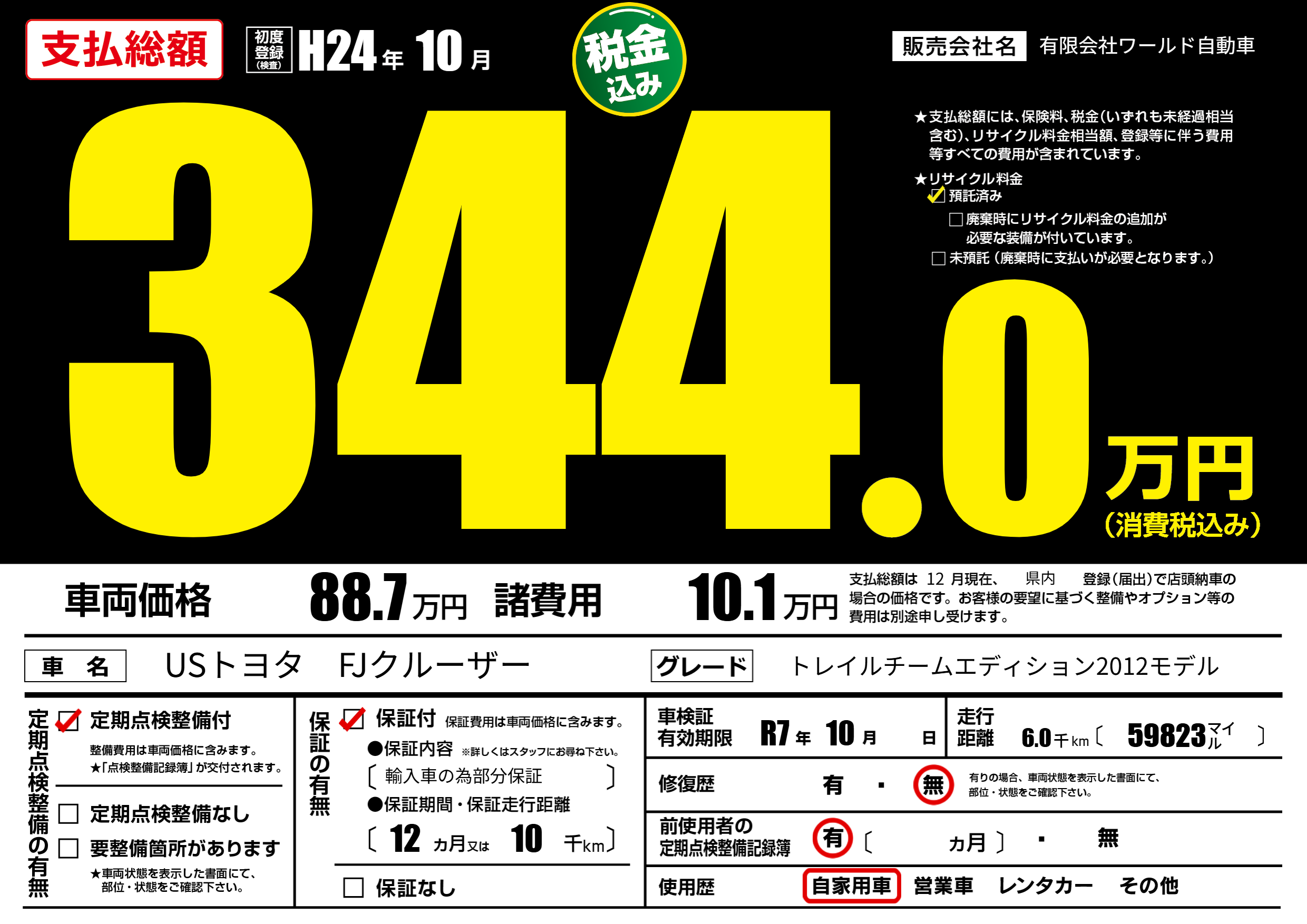 | 車名 | USトヨタ FJクルーザー | グレード ミッション 排気量 |