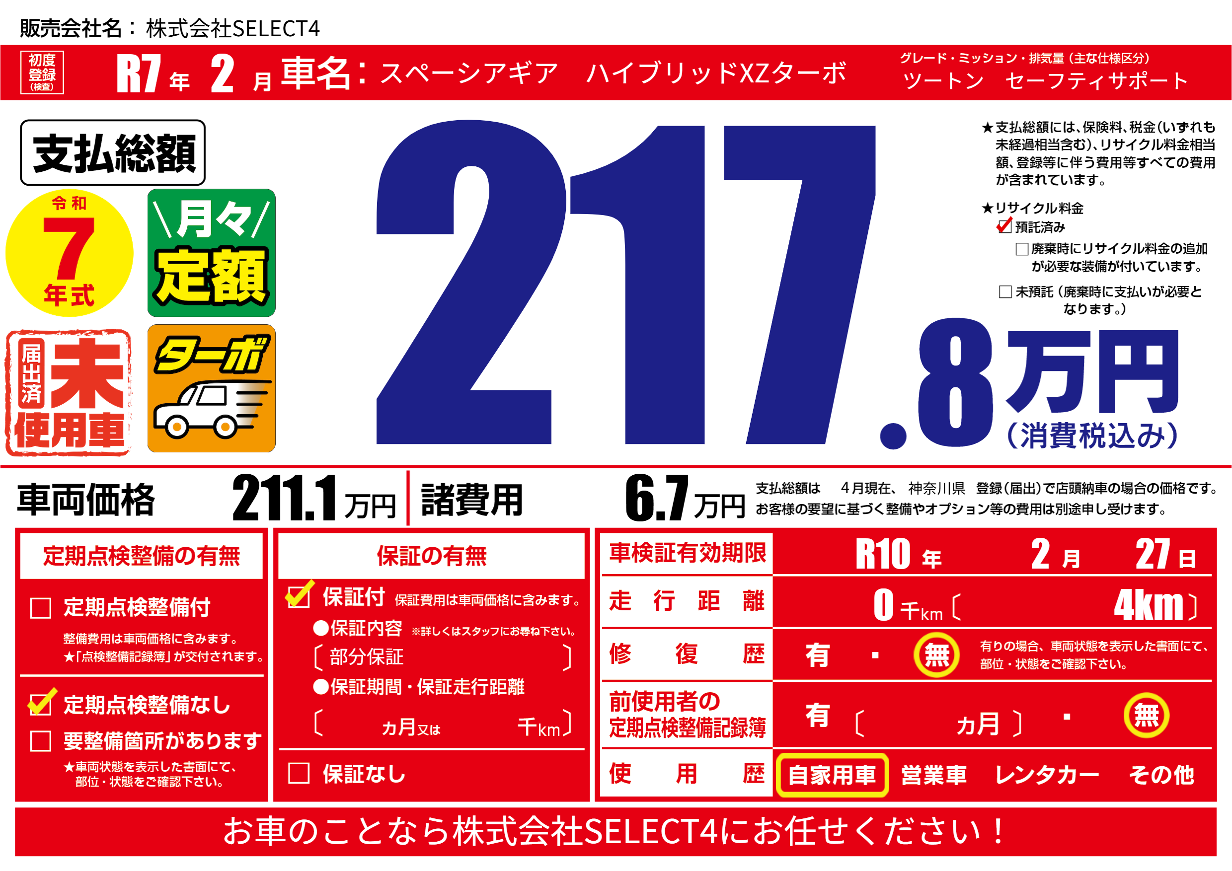 | 車検制限 | R10年 2月 27日 | ||