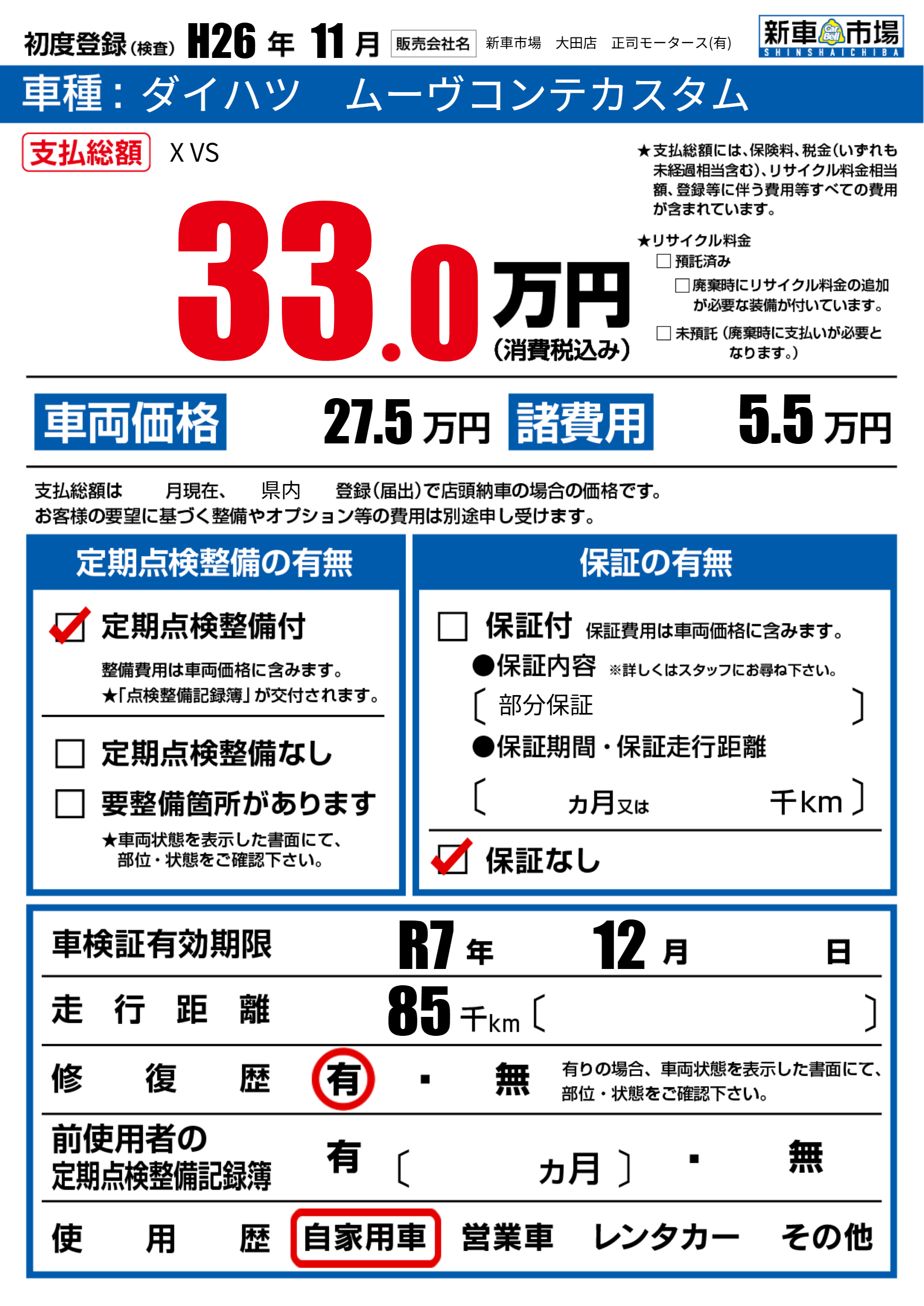 | 車名 | ダイハツ ムーヴコンテカスタム | グレード ミッション 排気量 |