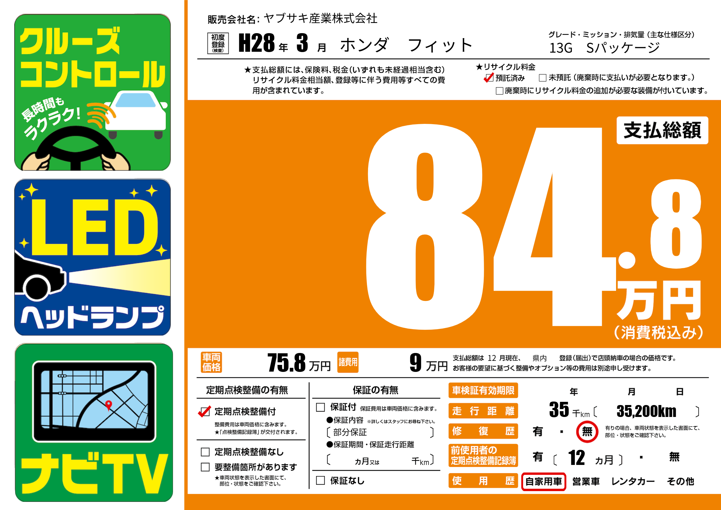 | 走行キロ | 3.5万km | 初年度登録 | H28年3月 |