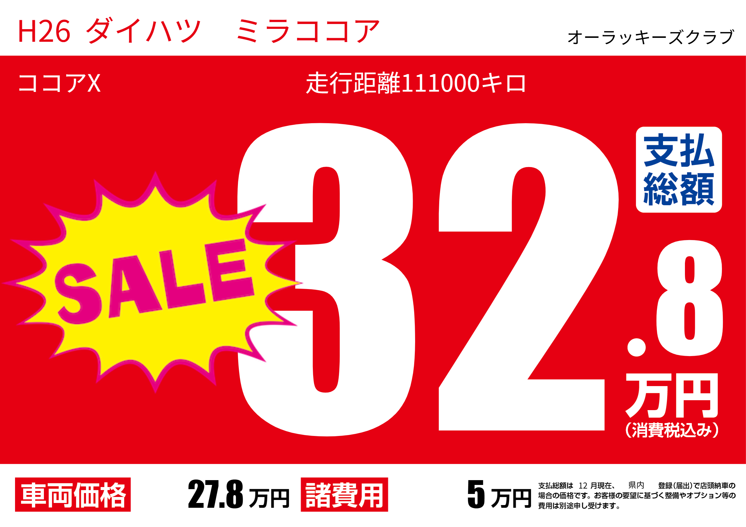 | 車名 | H26 ダイハツ ミラココア | グレード ミッション 排気量 |
