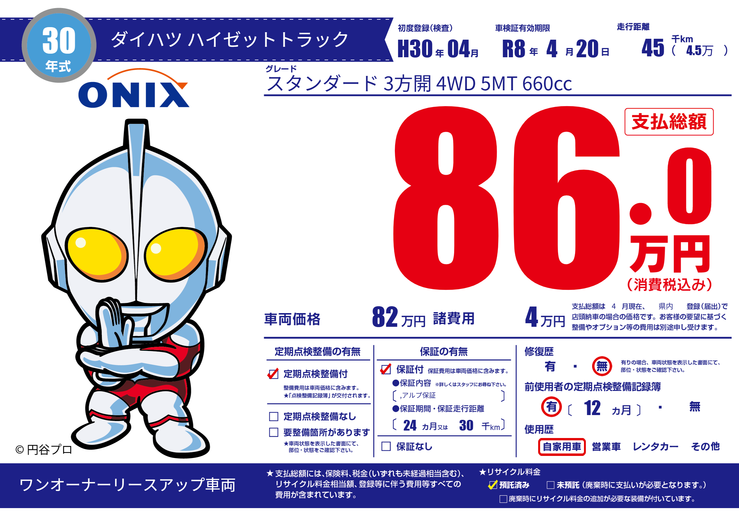 | 走行キロ | 4.5万km | 初年度登録 | H30年04月 |