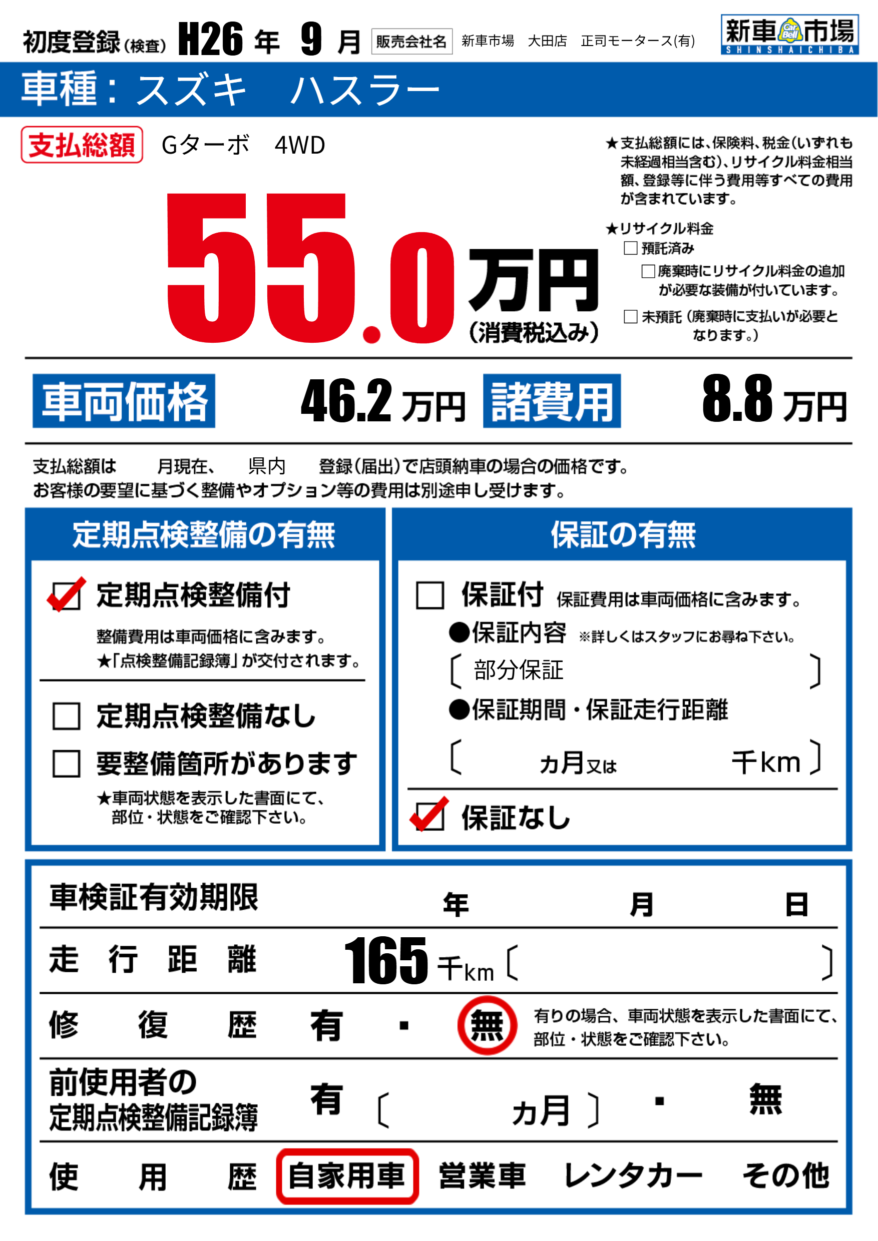 保証なし 保証内容(部分保証) ---ヶ月または()千kmまで |