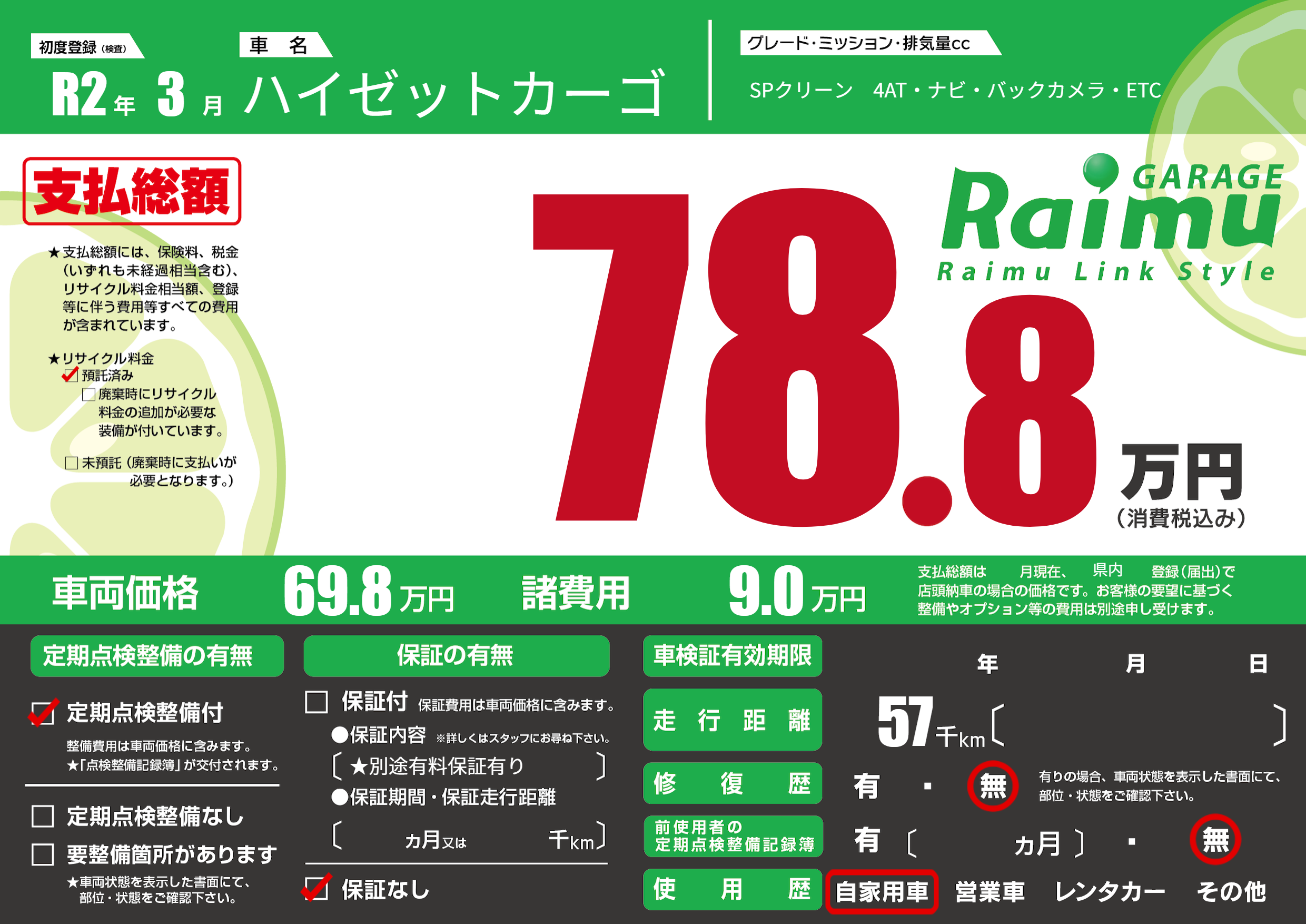保証なし 保証内容(★別途有料保証有り) ---ヶ月または()千kmまで |