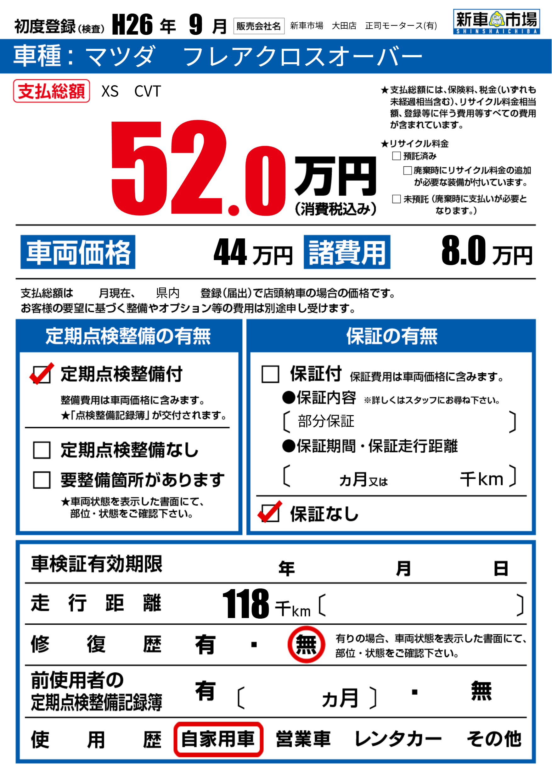 | 走行キロ | 11.8万km | 初年度登録 | H26年9月 |