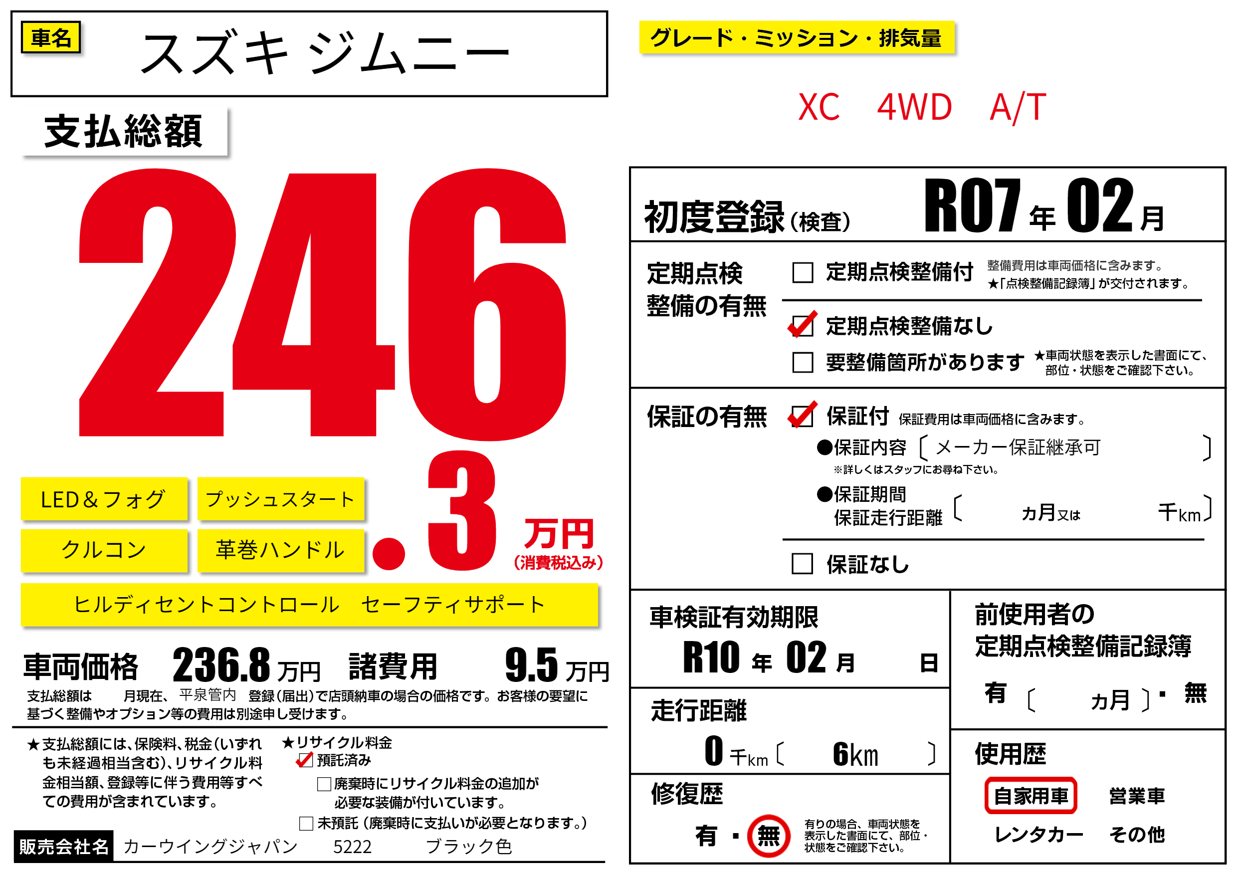 | 車検制限 | R10年 02月 - 日 | ||