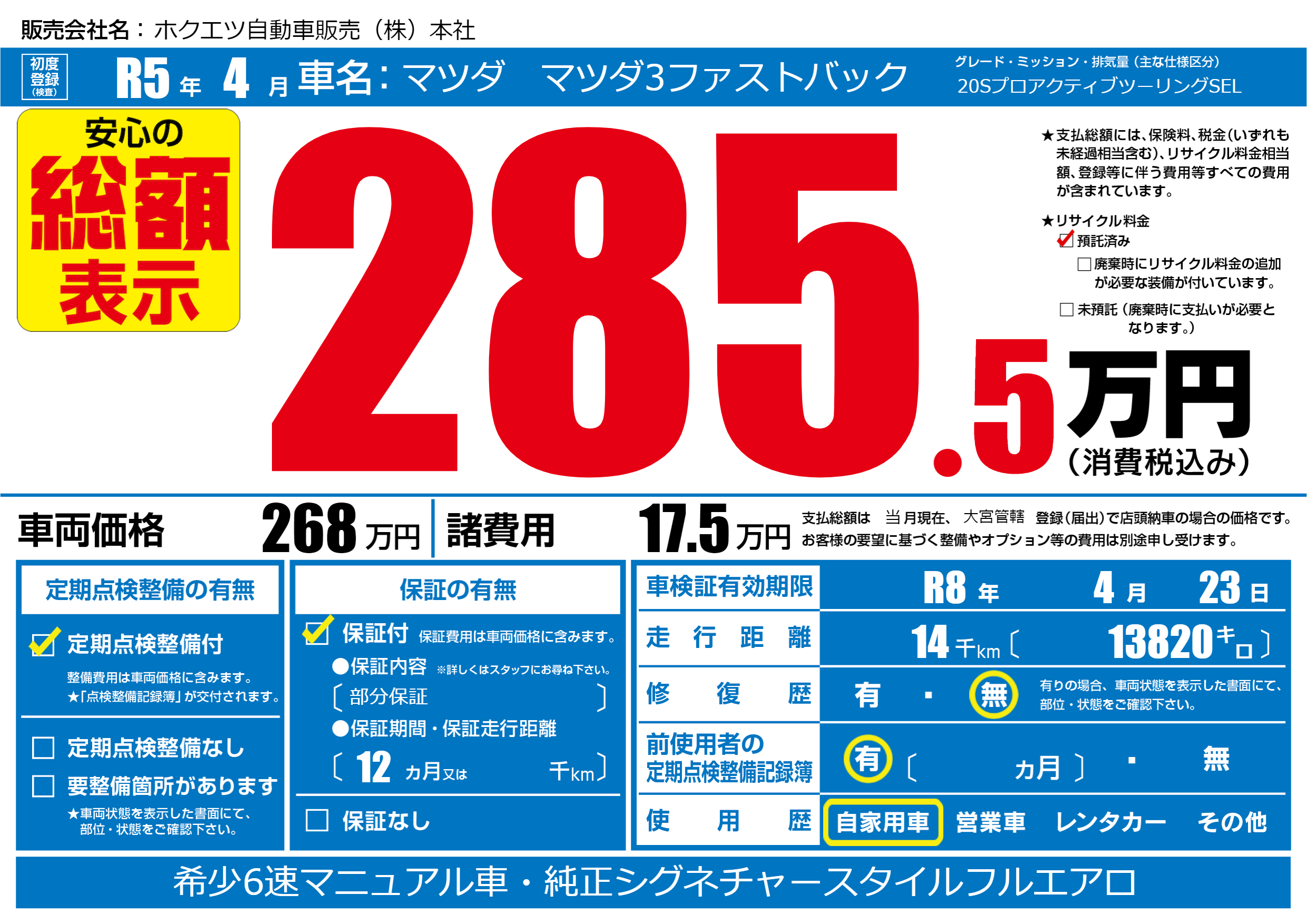 | 車名 | マツダ マツダ3ファストバック | グレード ミッション 排気量 |