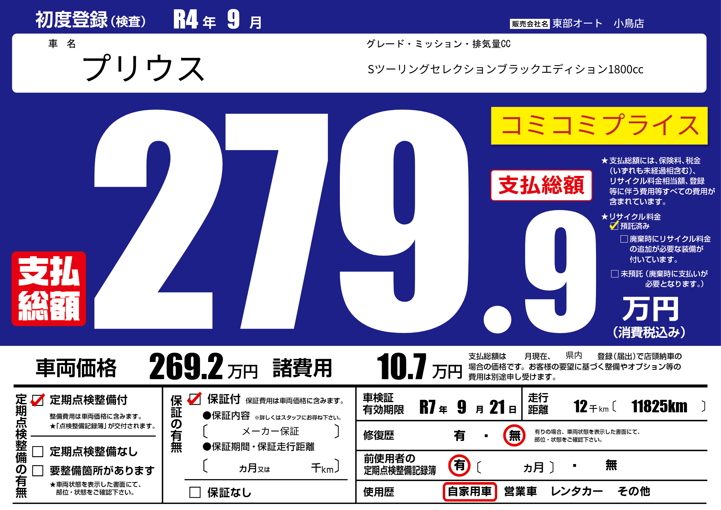 | 車名 | プリウス | グレード ミッション 排気量 |